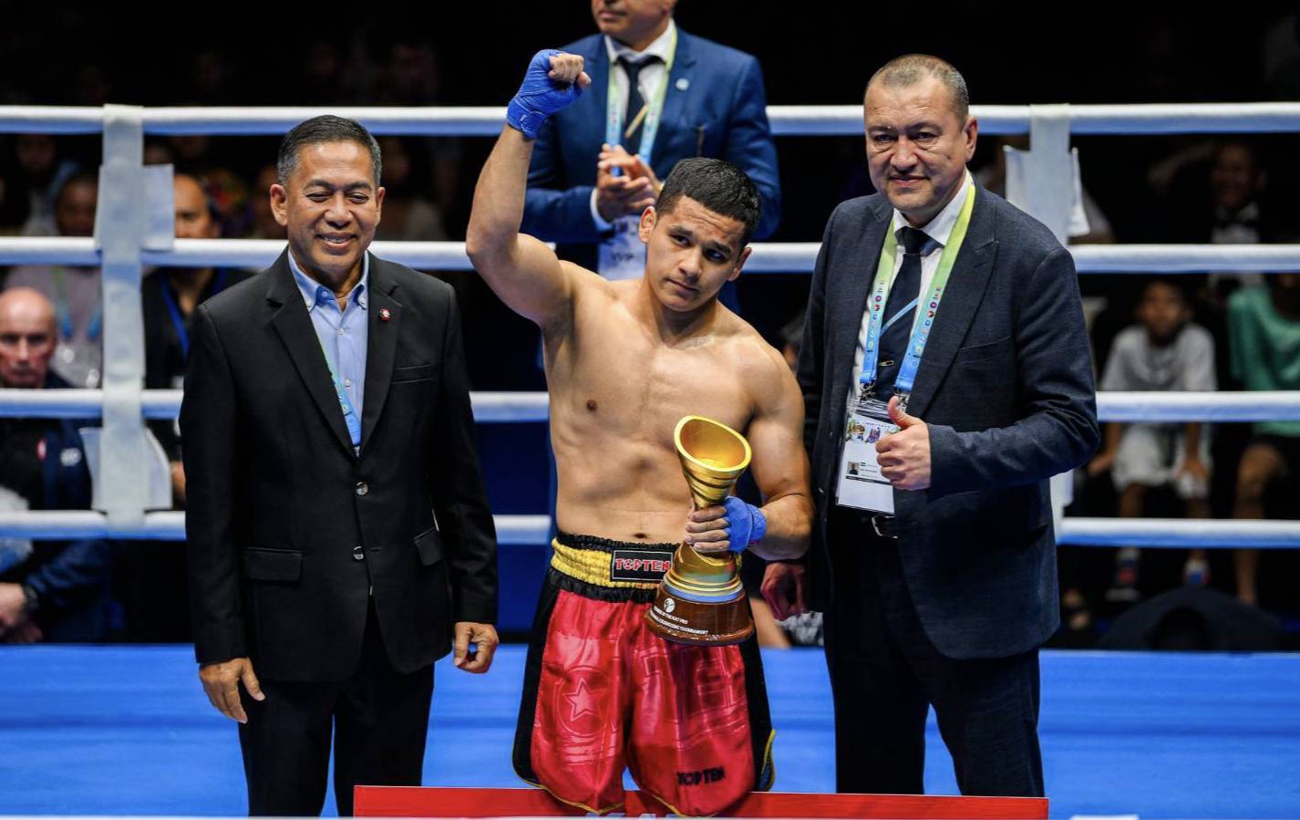 คู่ที่ 3 รุ่นน้ำหนัก 75 กก.ชาย อับรอร์ คาคีมอฟ (คีร์กีซสถาน) ชนะน็อกเอาต์ โนดีร์ ไคริดดีนอฟ (อุซเบกิสถาน)