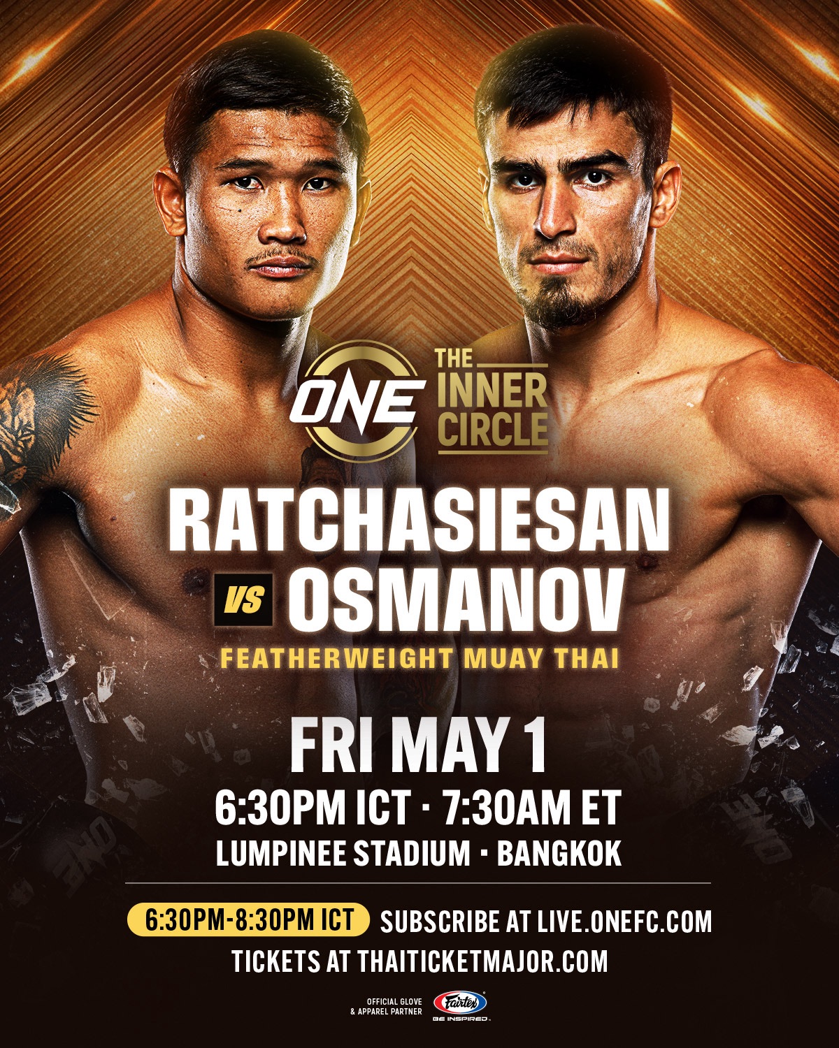 ฉลองวันแรงงานสานต่อความมันเต็มขั้น ด้วยคู่มวยสุดเดือดในรายการ The Inner Circle ณ สนามมวยเวทีลุมพินี (รามอินทรา) ในวันศุกร์ที่ 1 พ.ค. นี้ ถ่ายทอดสดเฉพาะสมาชิกทาง Live.ONEFC.com ตั้งแต่เวลา 18.30-20.30 น. โดยคู่เอกประกบให้ “ราชสีห์อีสาน เหล่าโชคเจริญ” มวยซ้ายอันตราย วัย 27 ปี จากสุรินทร์ พบกับ “เอลบรุส ออสมานอฟ” นักสู้เชิงสวย วัย 24 ปี จากรัสเซีย ภายใต้กติกามวยไทย รุ่นเฟเธอร์เวต (145-155 ป.)