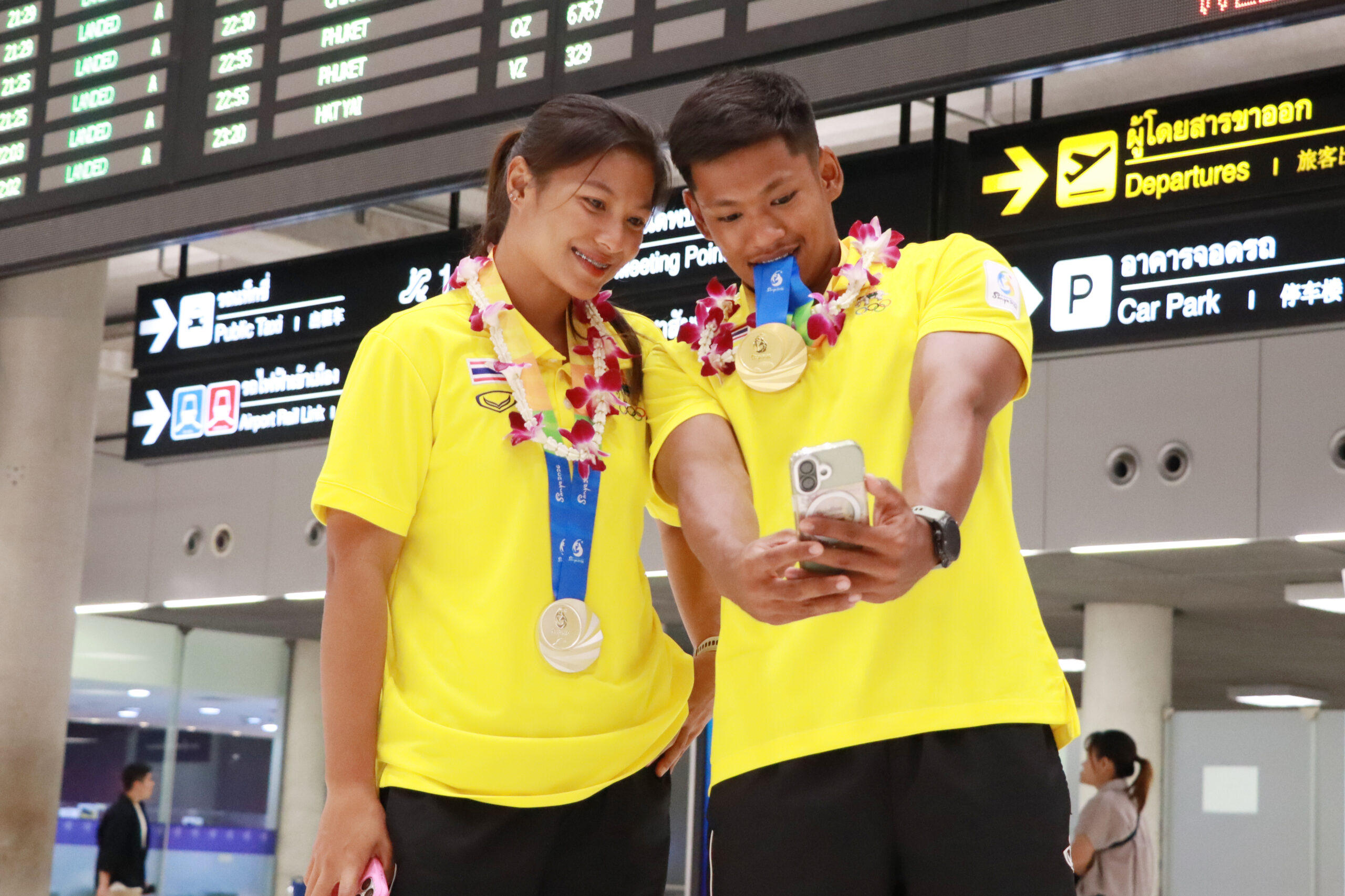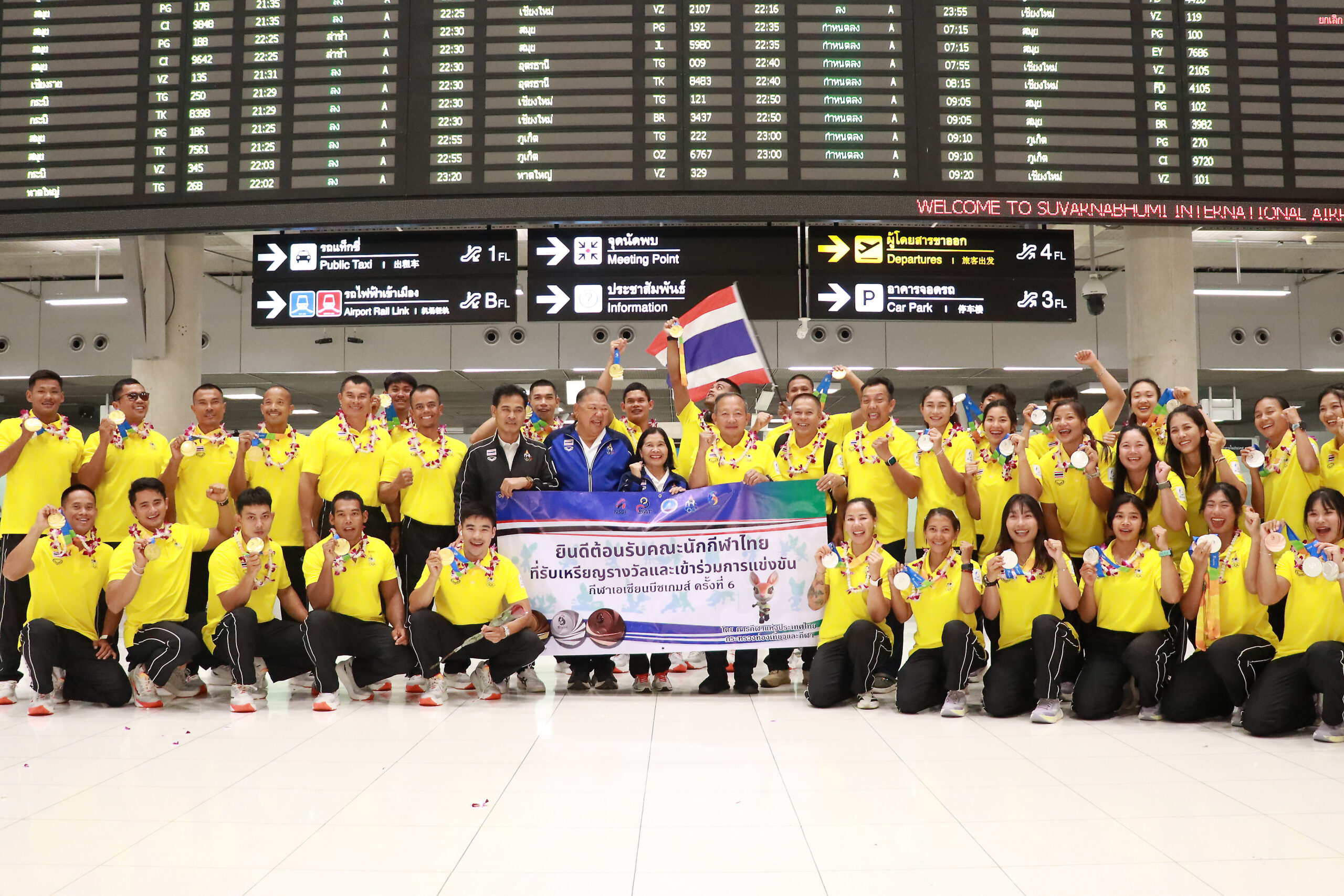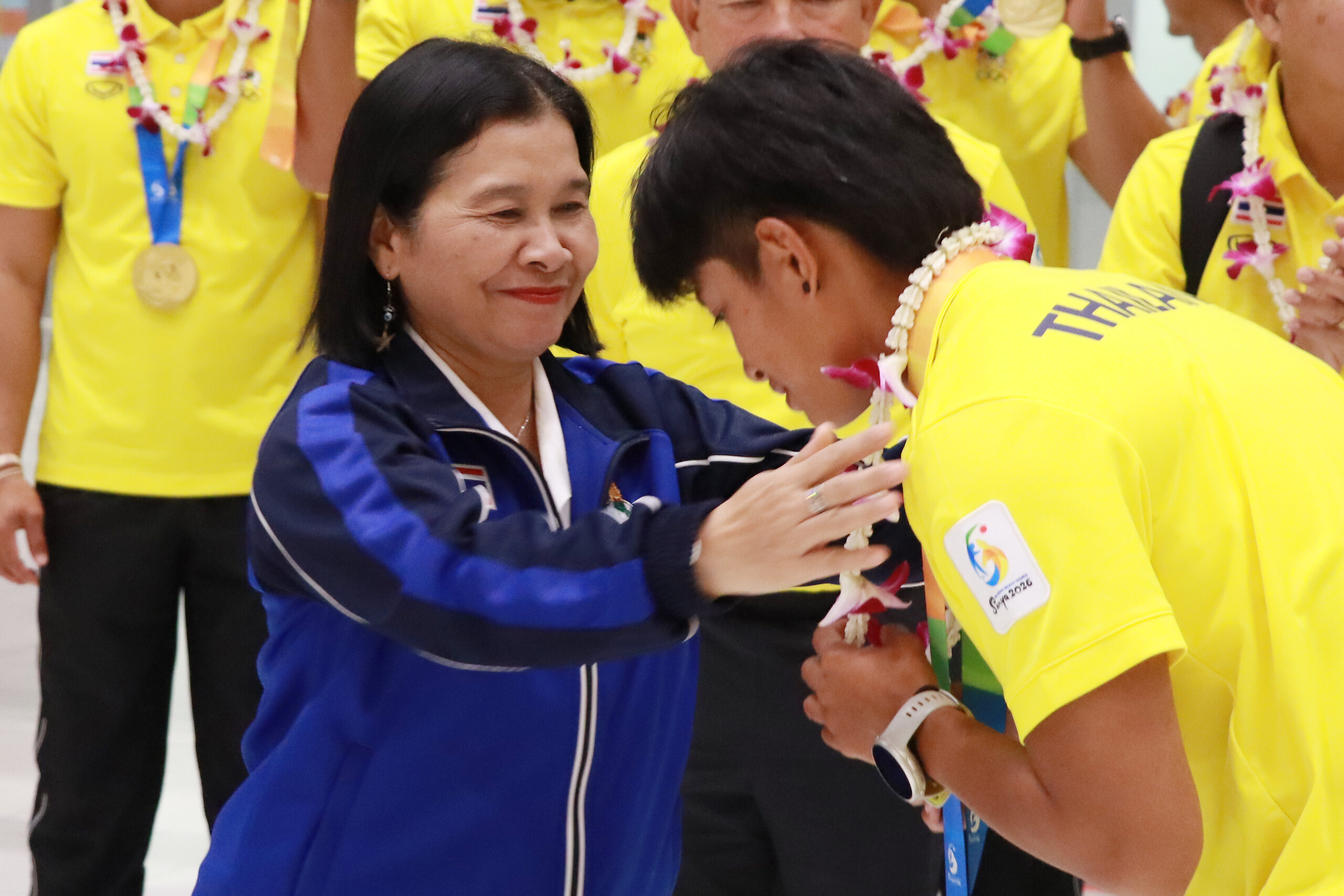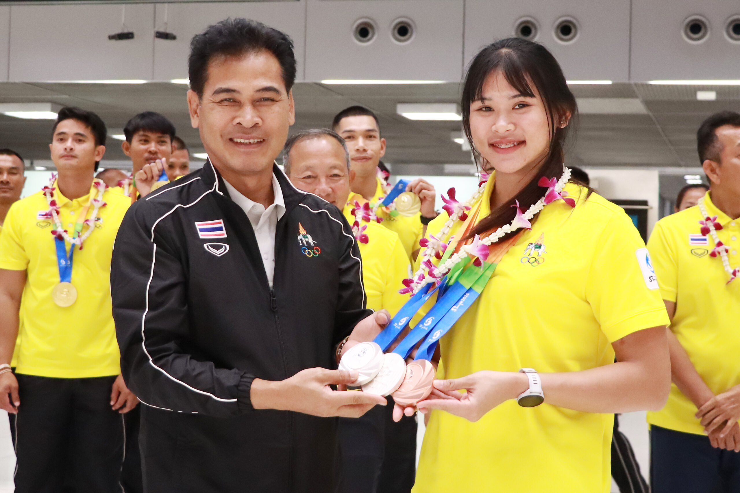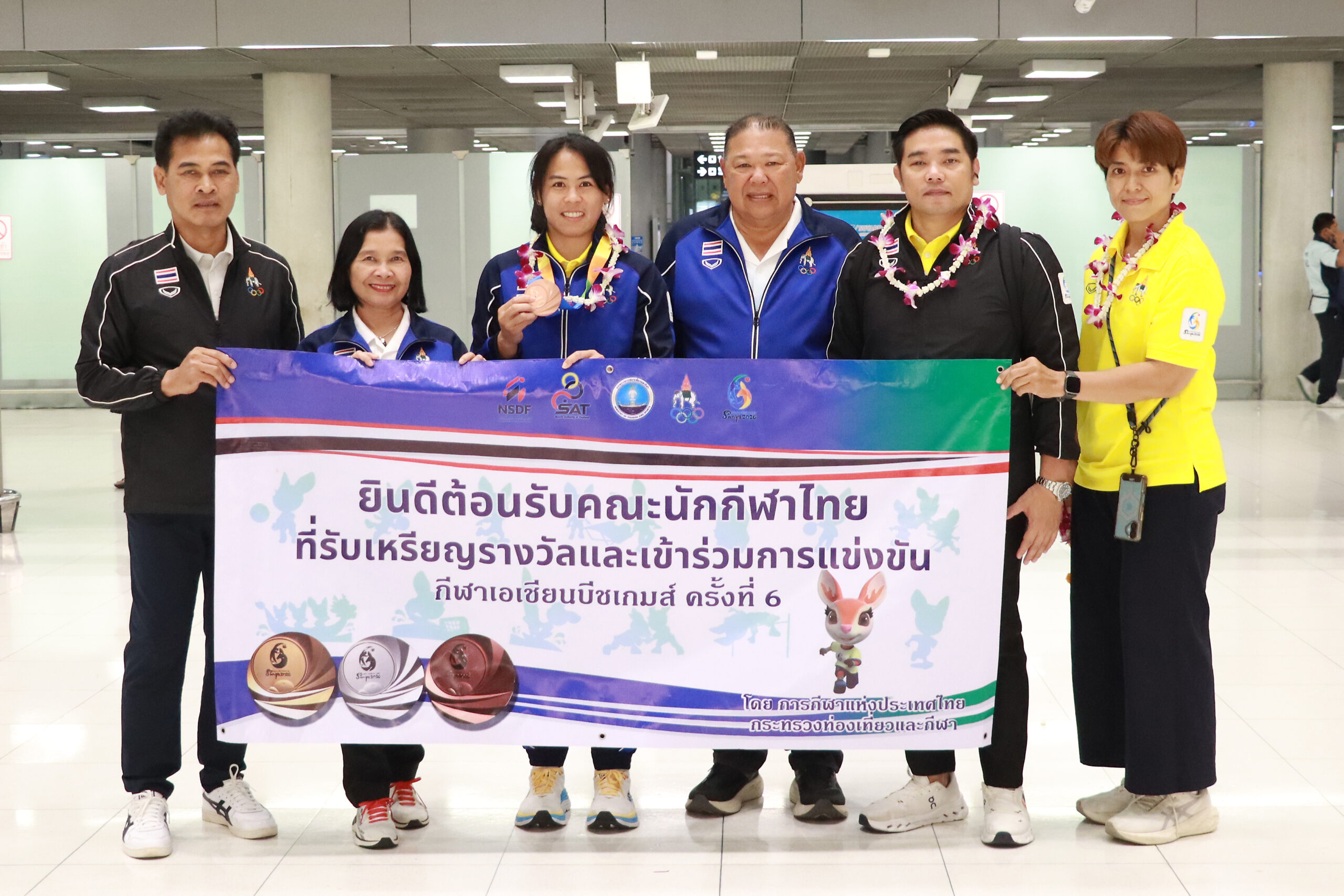 นางสาววนิดา พันธ์สะอาด รองปลัดกระทรวงการท่องเที่ยวและกีฬา พร้อมด้วย นายสุรศักดิ์ เกิดจันทึก รองผู้ว่าการ การกีฬาแห่งประเทศไทย (กกท.) ฝ่ายส่งเสริมกีฬา, นายธรรมวรรธ วงศ์เจริญยศ กรรมการการกีฬาแห่งประเทศไทย , รองศาสตราจารย์ ชาญชัย สุขสุวรรณ์ กรรมการการกีฬาแห่งประเทศไทย ร่วมต้อนรับ คณะนักกีฬาทีมชาติไทย ที่เข้าร่วมการแข่งขันกีฬาเอเชียนบีชเกมส์ ครั้งที่ 6 ณ เมืองซานย่า มณฑลไห่หนาน สาธารณรัฐประชาชนจีน ชุดที่ 1 ณ ท่าอากาศยานสุวรรณภูมิ เมื่อวันที่ 26 เมษายน 2569