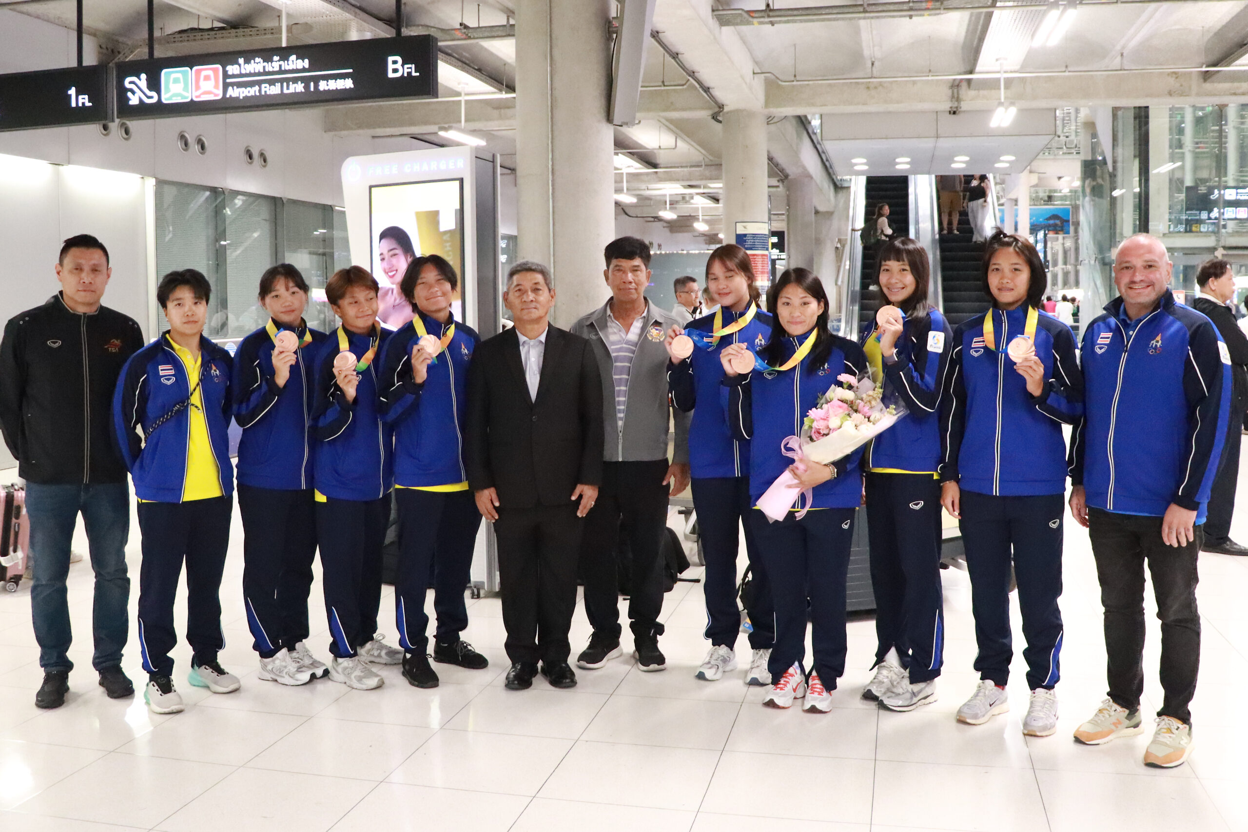 โดยคณะนักกีฬาที่เดินทางกลับมาในช่วงค่ำวันนี้ประกอบด้วย นักกีฬาว่ายน้ำ (โปโลน้ำ) หญิง ทำผลงานได้ 1 เหรียญทองแดง นำโดย น.ส.ภัทรพีร ศรีดี นางสาวฐานิตา คงช่วย น.ส.กันต์ฤทัย เรียงสันเทียะ ด.ญ.ปารณีย์ โชติโรจนอนันต์ น.ส.พิทยาภรณ์ ขวัญทองธนารีย์ น.ส.สโรชา เรื่องทรัพย์ไพศาล น.ส.พิมพ์พิญ งามเจริญสุขถาวร,