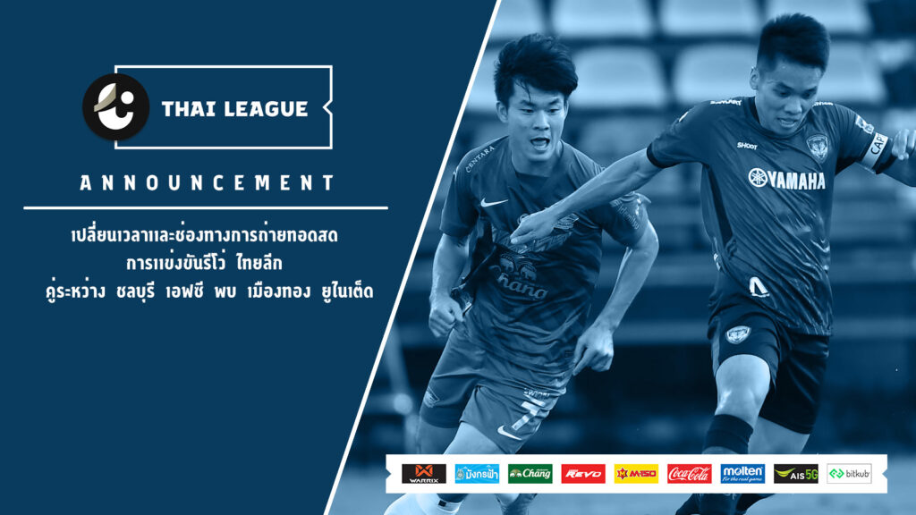 บริษัท ไทยลีก จำกัด ขอประกาศเปลี่ยนเวลาการแข่งขัน และช่องทางการถ่ายทอดสด สำหรับการแข่งขันฟุตบอลรีโว่ ไทยลีก ฤดูกาล 2564/65 คู่ระหว่าง ชลบุรี เอฟซี พบ เมืองทอง ยูไนเต็ด