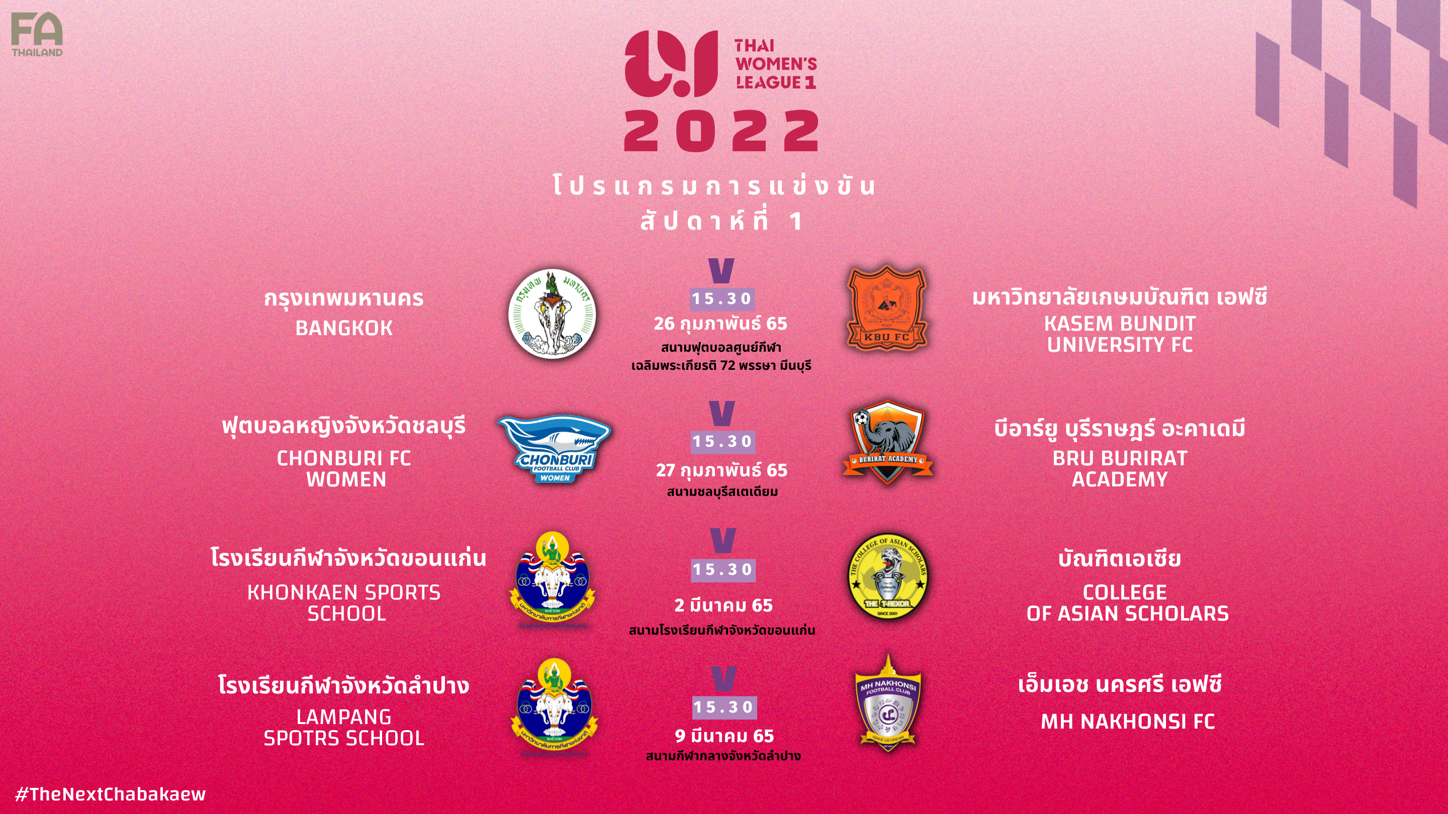 เวลา 15.30 น. ฟุตบอลหญิงชลบุรี พบกับ บีอาร์ยู บุรีราษฎร์ อคาเดมี่ สนาม ชลบุรี สเตเดียม