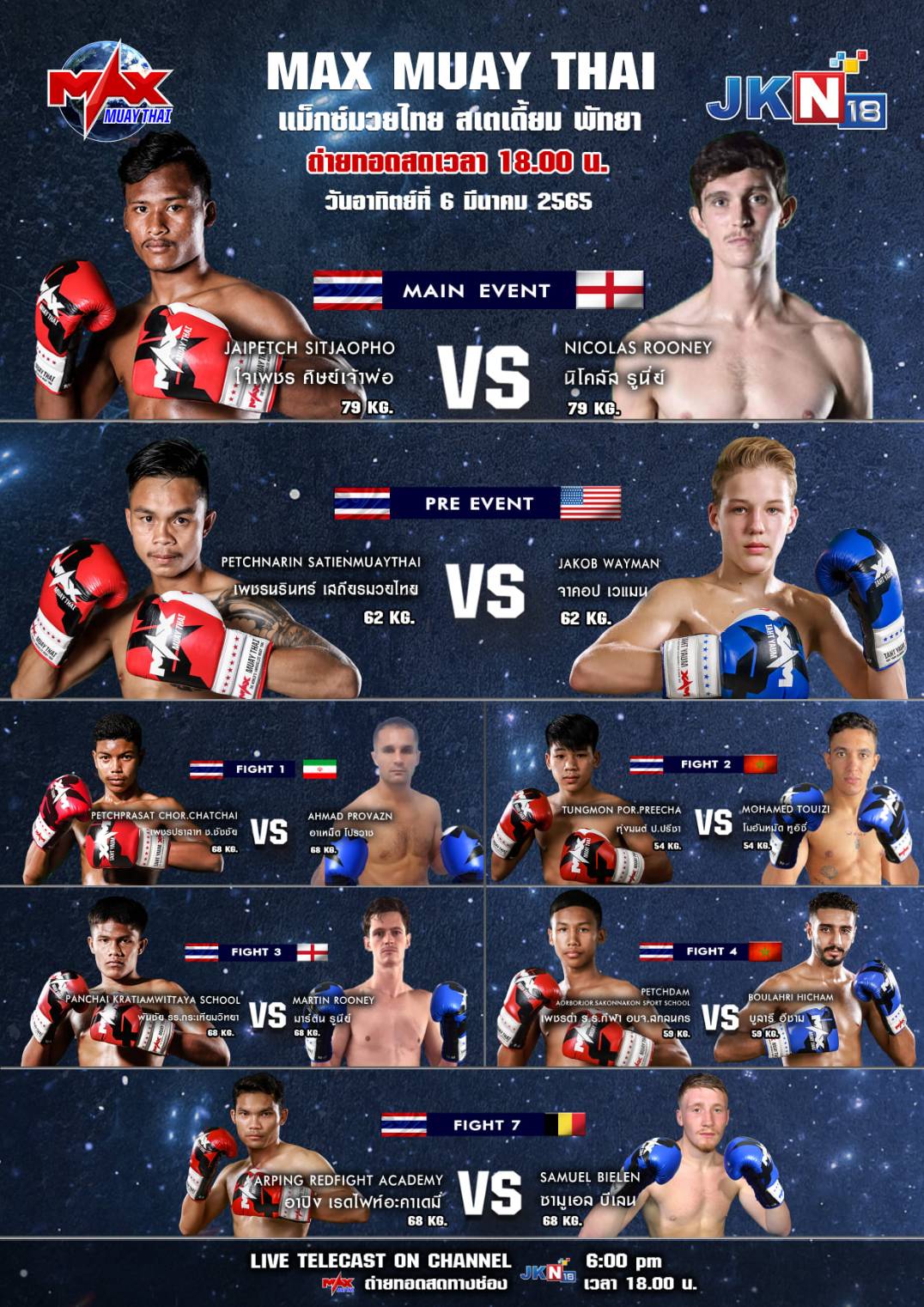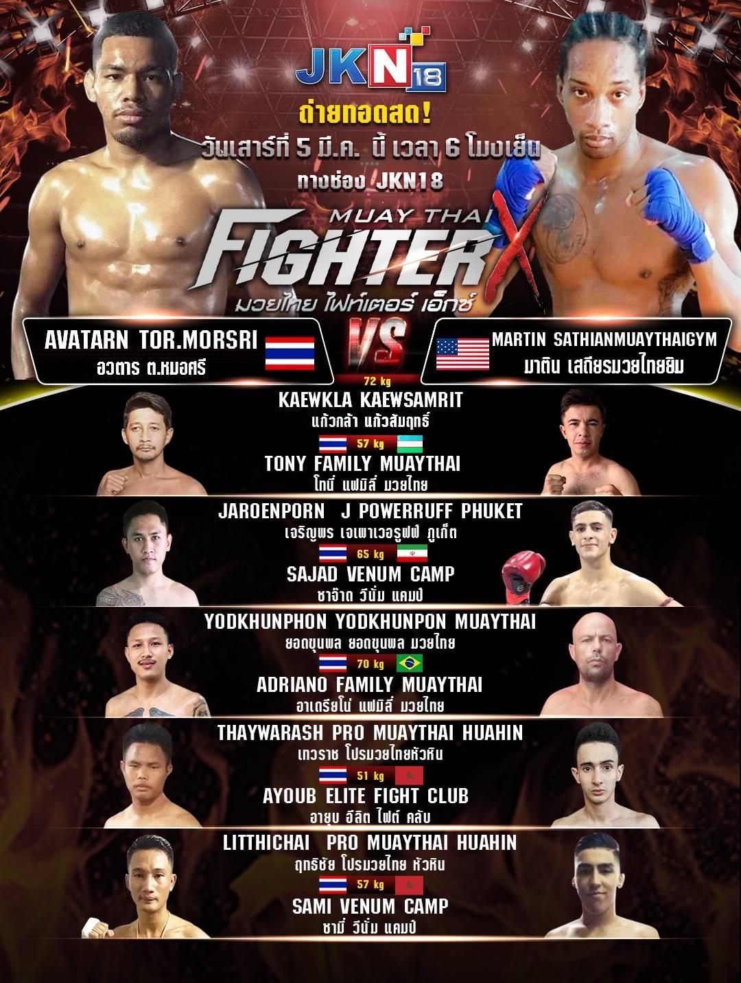 JKN18 ชวนแฟนมวยร่วมเชียร์ขุนพลนักชกไทย ปะทะ นักชกต่างชาติสุดโหด ส่งโปรแกรมคู่ชก วันที่ 5-6 มีนาคมนี้ สำหรับ 2 สังเวียนมวยไทย อย่าง รายการมวยไทย Fighter X และ รายการแม็กซ์มวยไทย ถ่ายทอดสด ส่งตรงความมันเร้าใจให้แฟนมวยร่วมเชียร์พร้อมกันทั่วประเทศ