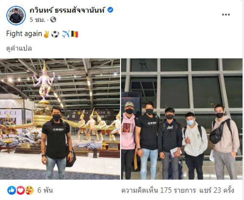 โดย กวินทร์ ธรรมสัจจานันท์ ได้เผยความรู้สึกผ่านเฟซบุ๊กส่วนตัวว่า “สุดท้ายวีซ่าเสร็จทันแบบเฉียดฉิว คืนนี้ต้องไปสนามบิน ตี 3 ครึ่ง พร้อมออกไปต่อสู้อีกรอบ เป็นกำลังใจให้ผมด้วยนะครับ”