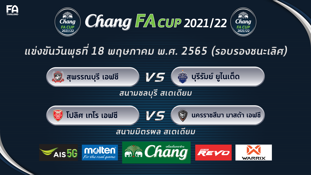 สุพรรณบุรี เอฟซี พบ บุรีรัมย์ ยูไนเต็ด และ โปลิศ เทโร เอฟซี ดวล นครราชสีมา มาสด้า เอฟซี ในศึกช้าง เอฟเอ คัพ รอบรองชนะเลิศ