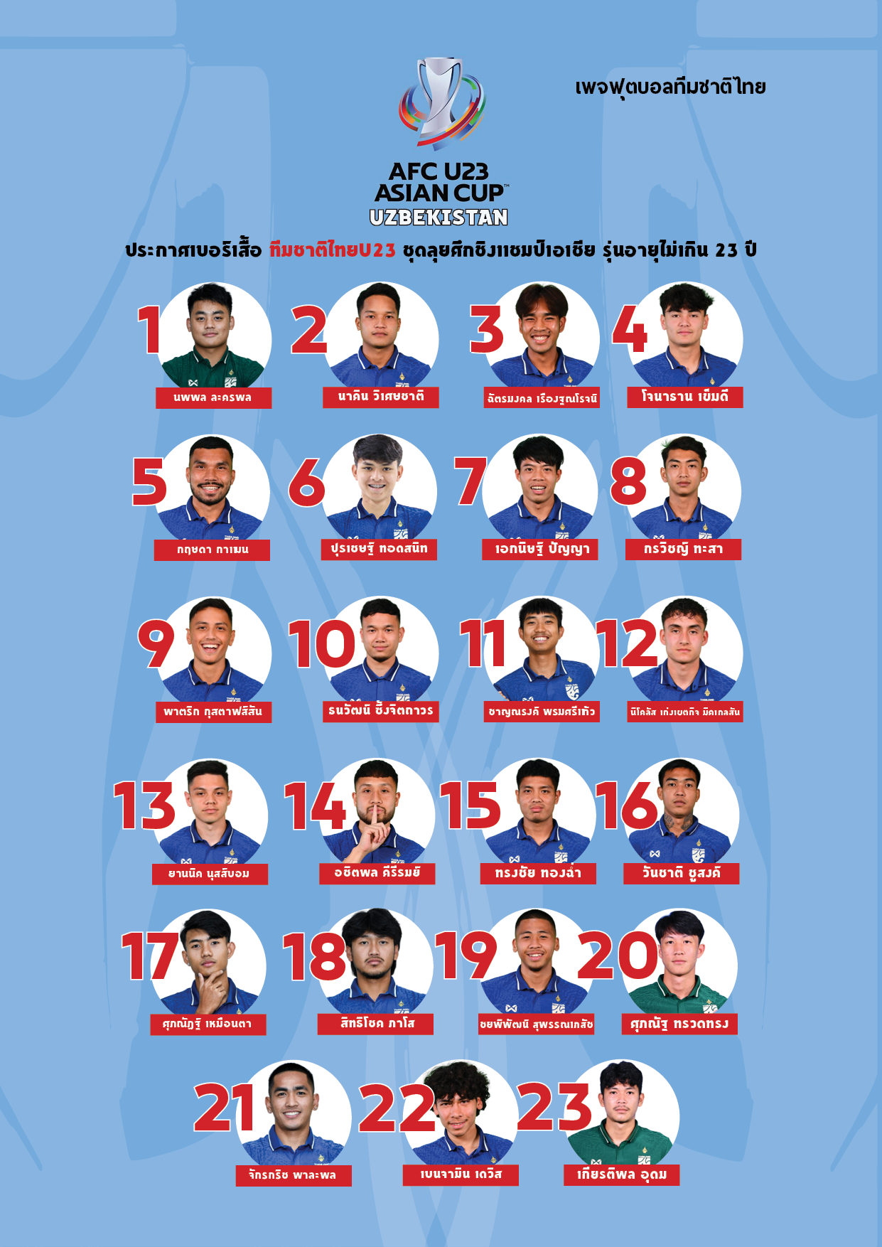 ประกาศเบอร์เสื้อ ทีมชาติไทย U23 ชุดลุยศึกชิงแชมป์เอเชีย รุ่นอายุไม่เกิน 23 ปี ที่ อุซเบกิสถาน ขณะ ปุรเชษฐ์ เสียบแทน อิรฟาน ที่เจ็บฟุตบอลชายทีมชาติไทย รุ่นอายุไม่เกิน 23 ปี เปิดเผยเบอร์เสื้อ 23 นักเตะในการลุยศึกชิงแชมป์เอเชีย 2022 รุ่นอายุไม่เกิน 23 ปี ที่ประเทศอุซเบกิสถาน