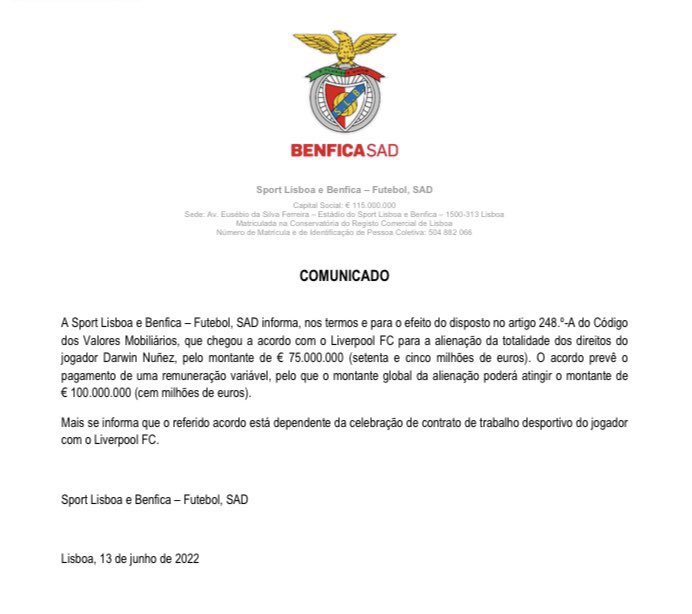 เบนฟิก้า ประกาศอย่างเป็นทางการ ยอมรับข้อเสนอซื้อตัว ดาร์วิน นูเญซ จากลิเวอร์พูลแล้ว ด้วยค่าตัว 75 ล้านยูโร บวกโบนัสอีก 25 ล้านยูโร โดยจะเดินทางมาตรวจร่างกายในวันนี้