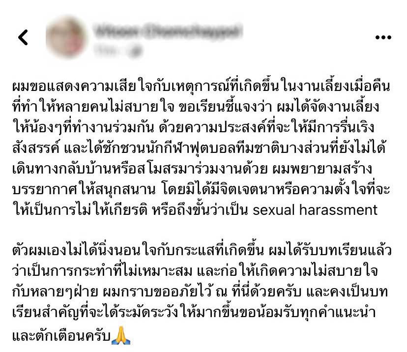 ล่าสุด “มาดามตี๋” วิทูรณ์ ชมชายผล มือขวาคนสนิทของมาดามแป้ง ได้ออกมาขอโทษเกี่ยวกับเหตุการ์ณดังกล่าวแล้ว “ผมขอแสดงความเสียใจกับเหตุการณ์ที่เกิดขึ้นในงานเลี้ยงเมื่อคืน ที่ทำให้หลายคนไม่สบายใจ ขอเรียนชี้แจงว่า ผมได้จัดงานเลี้ยงให้น้องๆที่ทำงานร่วมกัน ด้วยความประสงค์ที่จะให้มีการรื่นเริงสังสรรค์ และได้ชักชวนนักกีฬาฟุตบอลทีมชาติบางส่วนที่ยังไม่ได้เดินทางกลับบ้านหรือสโมสรมาร่วมงานด้วย ผมพยายามสร้างบรรยากาศให้สนุกสนาน โดยมิได้มีจิตเจตนาหรือความตั้งใจที่จะให้เป็นการไม่ให้เกียรติ หรือถึงขั้นว่าเป็น sexual harassment