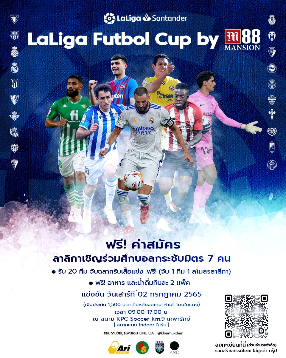 คอบอลอย่างเราพลาดได้อย่างไร หยิบสตั๊ด รวมเพื่อน มาเตะบอลกัน! กับกิจกรรมดีบอกต่อ ที่เปิดโอกาสให้ร่วมสนุกกับการแข่งขันฟุตบอล ภายใต้งาน “LaLiga Futbol Cup by M88 2022” งานที่จะชวนทุกท่าน ที่ชื่นชอบในการเตะบอล ออกกำลังกาย รวมทีมมาร่วมสนุกไปด้วยกัน กับการแข่งขันฟุตบอลทัวร์นาเมนท์พิเศษ ที่เต็มไปด้วยความสนุกเเละมิตรภาพเเบบครอบครัว “ลาลีกา” เตะบอลมันส์ Fun ให้สุด !