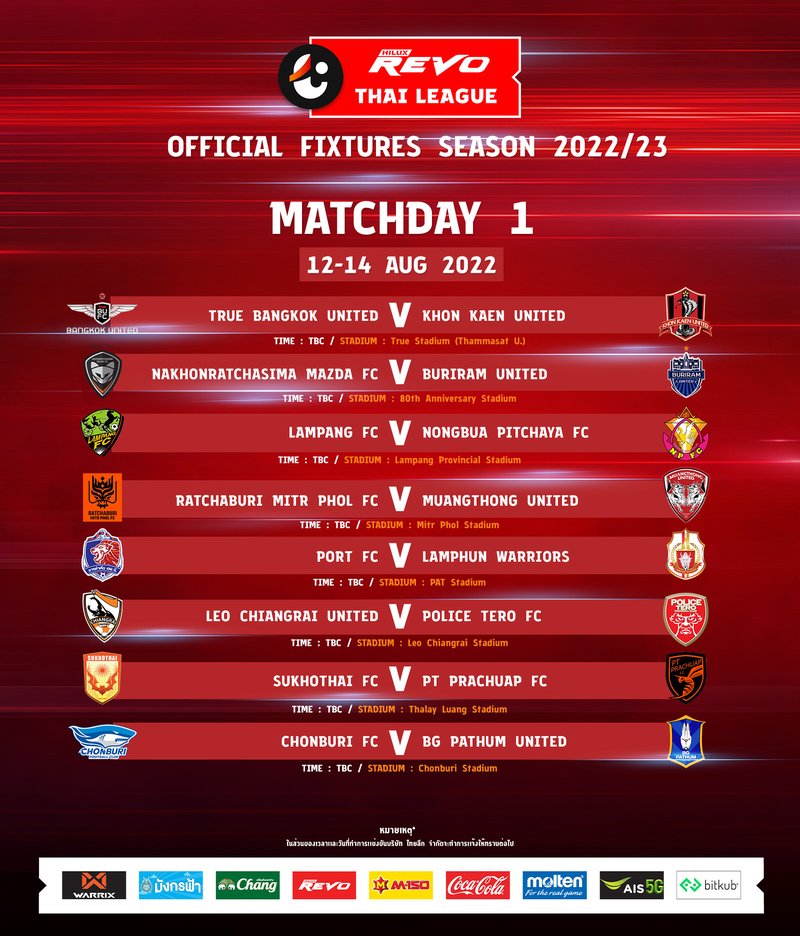 ตามที่ บริษัท ไทยลีก จำกัด ได้ประกาศเรื่อง การแข่งขันฟุตบอลรีโว่ ไทยลีก ที่จะเริ่มขึ้นในวันที่ 12 สิงหาคม 2565 นั้น เพื่อเป็นการเตรียมความพร้อมสำหรับการแข่งขัน ไทยลีก จึงขอแจ้งการประกบคู่การแข่งขันในเลกที่ 1 ของฤดูกาลนี้ ให้รับทราบโดยทั่วกัน