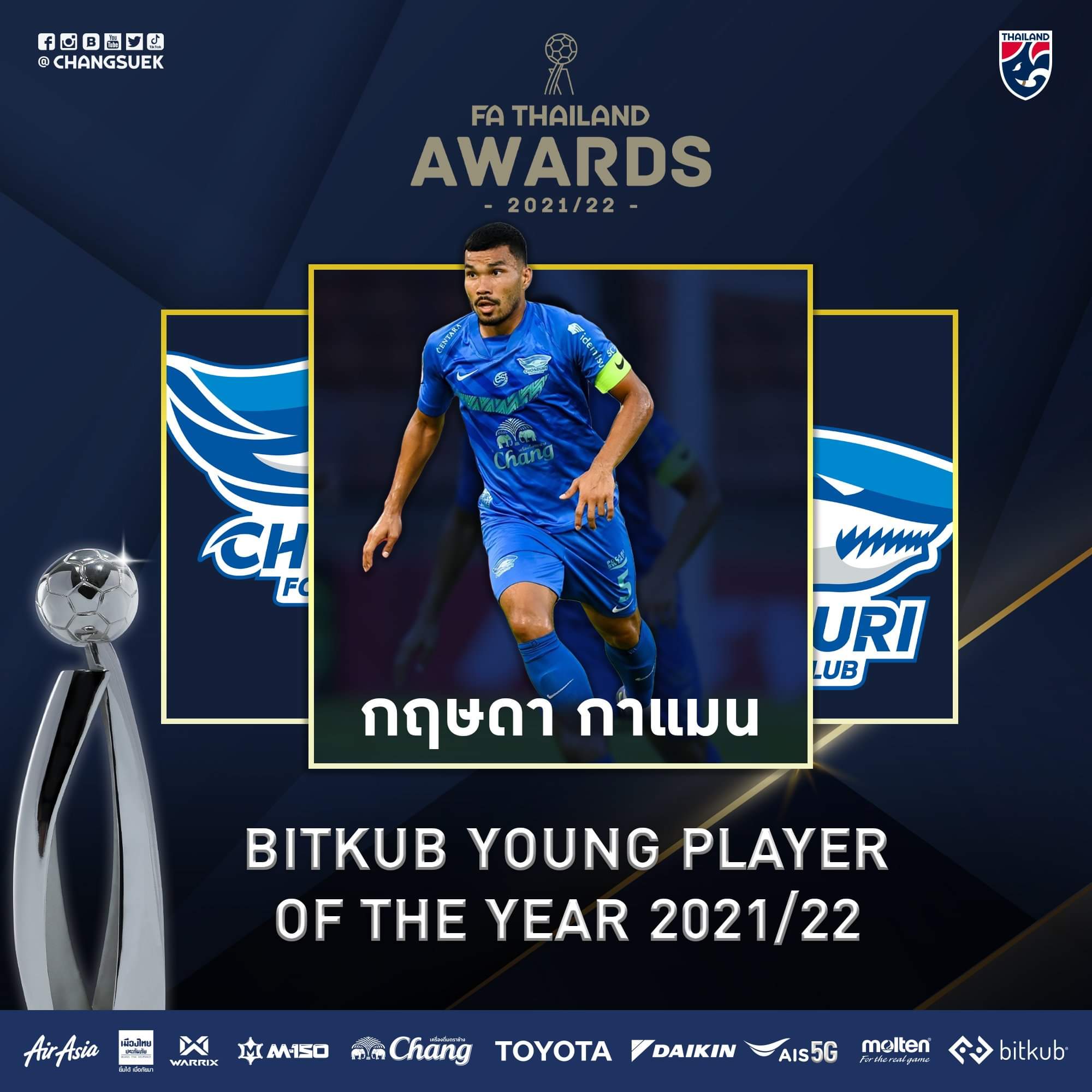 4.BITKUB YOUNG PLAYER OF THE YEAR 2021/22 – รางวัลนักเตะเยาวชนยอดเยี่ยมแห่งปี ได้แก่ กฤษดา กาแมน จาก สโมสร ชลบุรี เอฟซี ลงสนาม 2,414 นาที 27 นัด ยิง 2 ประตู MOM 2 นัด ใบเหลือง 4 ใบ
