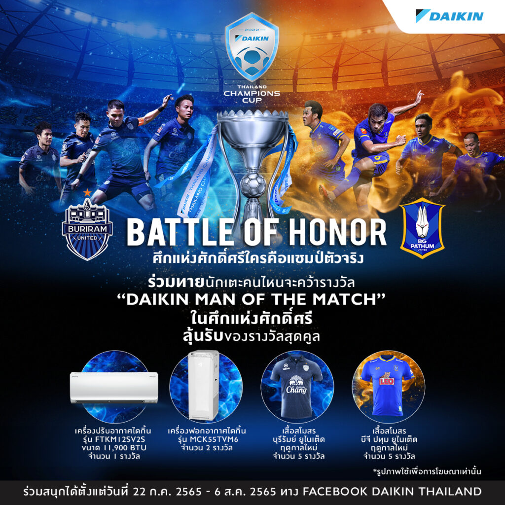 นอกจากนี้ยังมีกิจกรรมพิเศษสำหรับแฟนบอลไทย ร่วมทายนักเตะคนไหนจะคว้ารางวัล “DAIKIN MAN OF THE MATCH” ในศึกแห่งศักดิ์ศรี Daikin Thailand Champions Cup 2022 บุรีรัมย์ ยูไนเต็ด ปะทะ บีจี ปทุม ยูไนเต็ด ลุ้นรับรางวัลสุดพิเศษจากไดกิ้นรวมมูลค่ากว่า 100,000 บาท