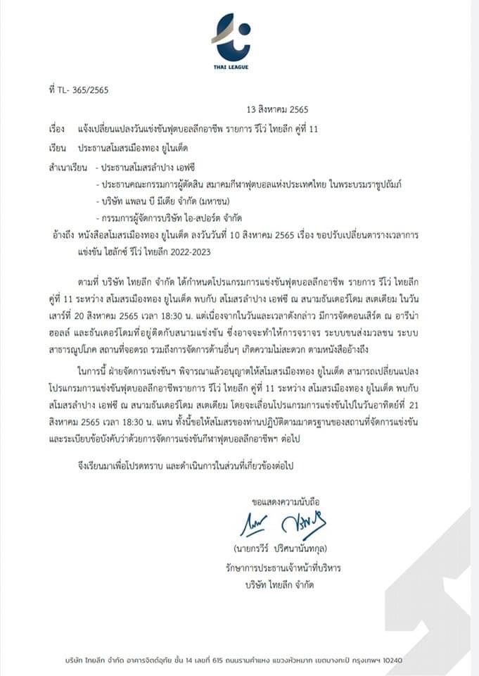 ไทยลีก ประกาศเลื่อนเกมคู่ระหว่าง เมืองทอง ยูไนเต็ด พบ ลำปาง เอฟซี จากวันที่ 20 ส.ค. ไปเป็น วันที่ 21 ส.ค.65