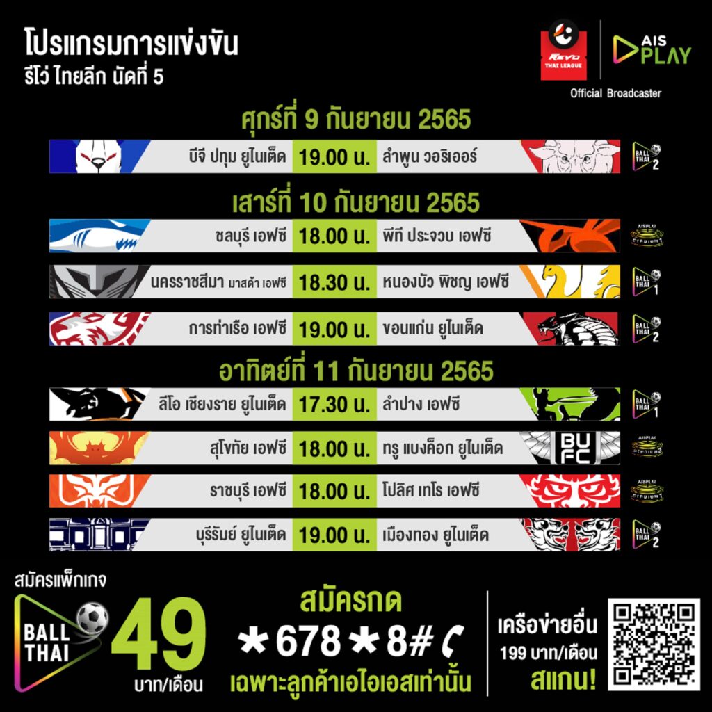 โปรแกรมฟุตบอลรีโว่ ไทยลีก สัปดาห์ที่ 5 ถ่ายทอดสดทาง AIS PLAY ทุกคู่