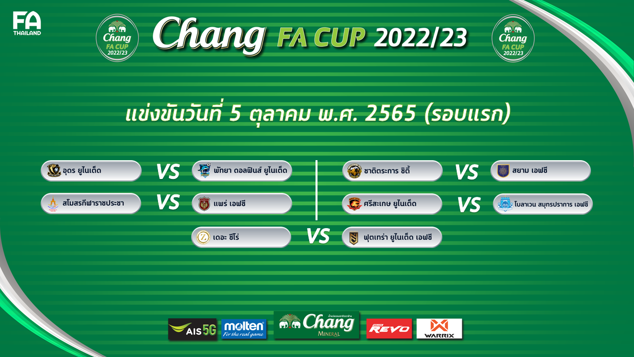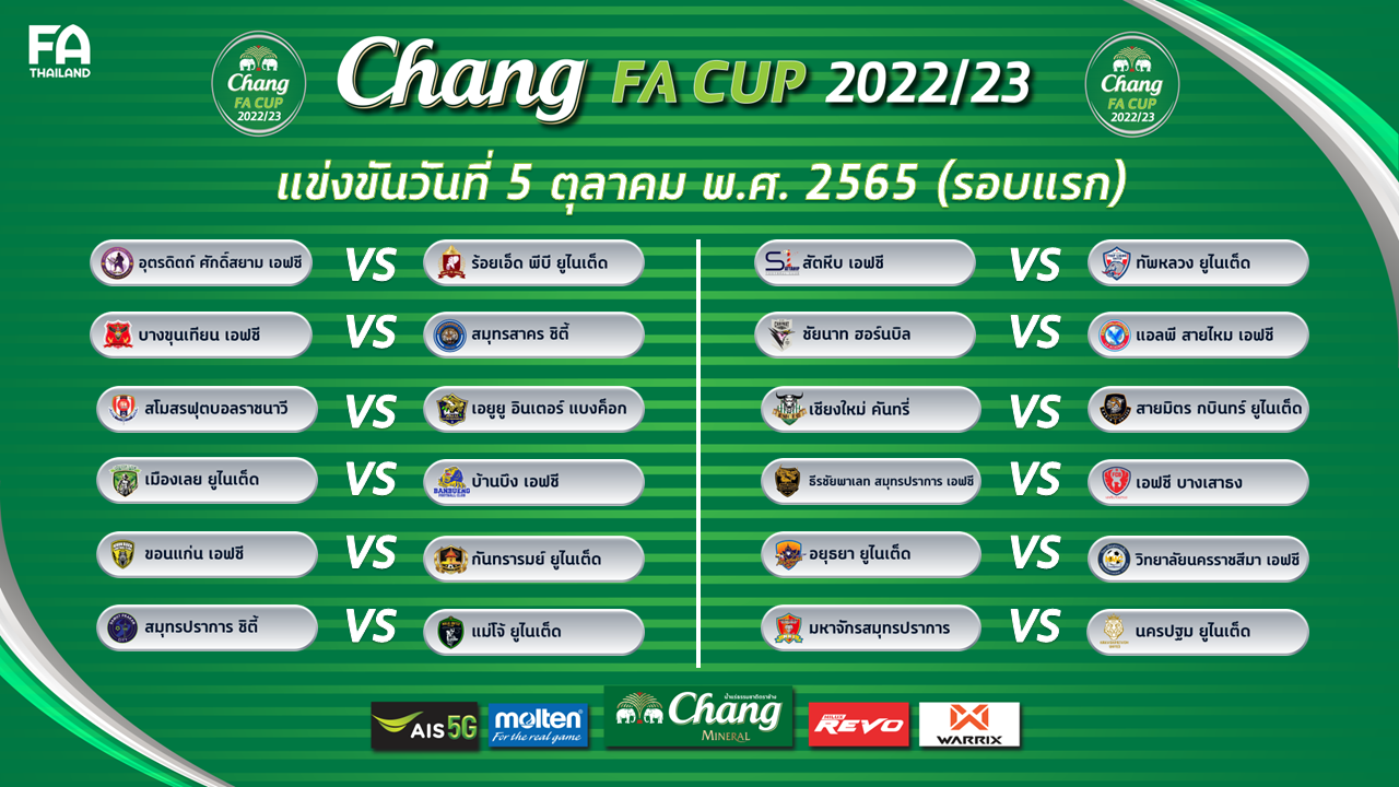 บริษัท ไทยลีก จำกัด ร่วมกับ บริษัท ช้าง อินเตอร์เนชั่นแนล จำกัด โดย เครื่องดื่มตราช้าง จัดพิธีจับสลากประกบคู่การแข่งขัน ฟุตบอลช้าง เอฟเอ คัพ 2022/23 รอบคัดเลือก และรอบแรก ณ Chang virtual studio สำหรับงานครั้งนี้ ได้รับเกียรติจาก คุณวรงค์ ทิวทัศน์ เลขานุการฝ่ายจัดการแข่งขัน บริษัท ไทยลีก จำกัด เป็นประธานในพิธีจับสลากครั้งนี้