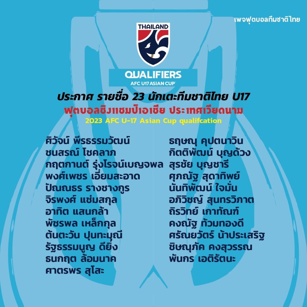 สมาคมกีฬาฟุตบอลแห่งประเทศไทย ประกาศ รายชื่อ 23 นักเตะทีมชาติไทย U17 เก็บตัวเพื่อเตรียมลุยศึกชิงแชมป์เอเชีย รอบคัดเลือก
