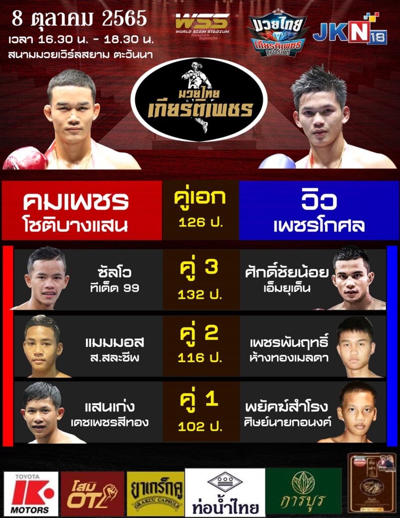 ในวันเสาร์ที่ 8 ตุลาคม นี้ เวลา 16.30-18.30 น. ณ เวทีมวยเวิร์ลสยามสเตเดี่ยม ตะวันนา บางกะปิ ทำเอาแฟนมวยฮือฮาเป็นอย่างมาก ด้วยการนำเอามวยแม่เหล็กมาให้ชมกันแบบไม่มีกั๊กโดยคู่เอกนำรายการเป็นการโคจรมาเจอกันเป็นครั้งที่ 4 ระหว่าง “คมเพชร โชติบางแสน” ที่เพิ่งฝากแผลสดให้กับ “วิว เพชรโกศล” สด ๆ ร้อน ๆ ที่เกาะสมุย มาดวลกันอีกครั้ง