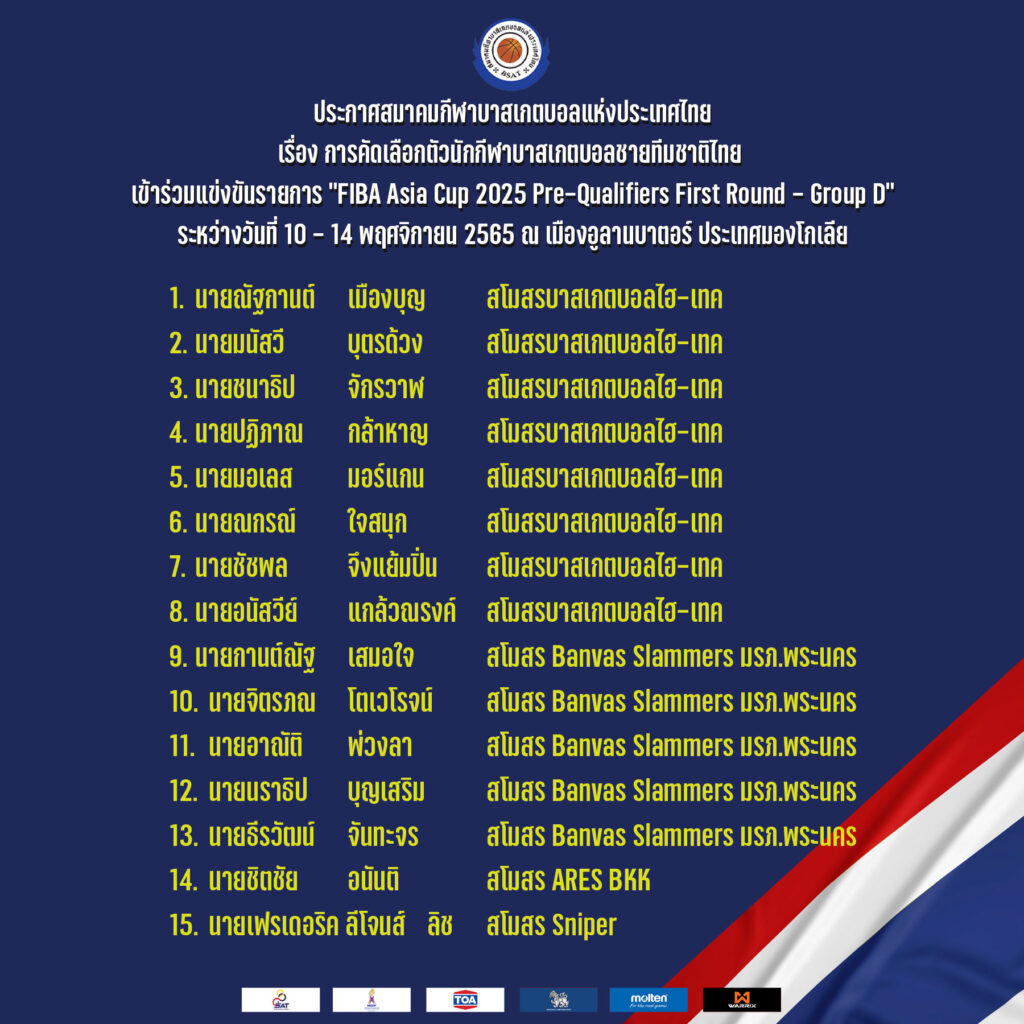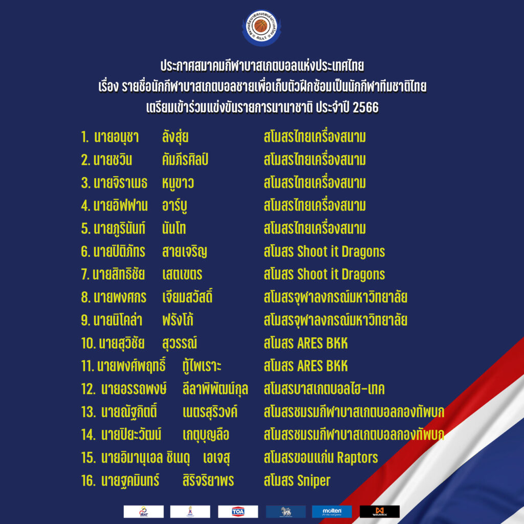 สมาคมกีฬาบาสเกตบอลแห่งประเทศไทย ประกาศ รายชื่อนักกีฬาใน การคัดเลือกตัวนักกีฬาบาสเกตบอลชายทีมชาติไทย เข้าร่วมแข่งขันรายการ นานาชาติ