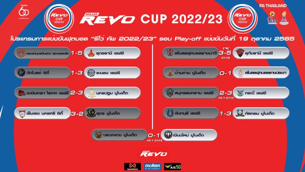 สรุปผลการแข่งขันฟุตบอลรีโว่ คัพ 2022/23 รอบเพลย์ออฟ ประจำวันที่ 19 ตุลาคม 2565 ดังนี้