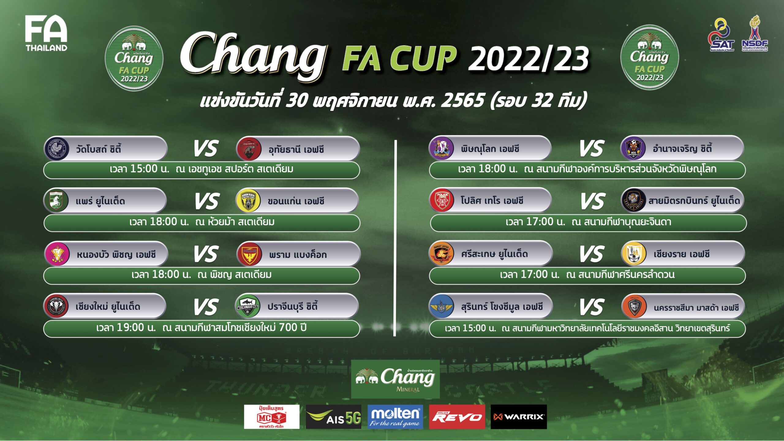 โปรแกรมการแข่งขันฟุตบอล ช้าง เอฟเอ คัพ รอบ 32 ทีมสุดท้าย วันพุธที่ 30 พฤศจิกายน 2565