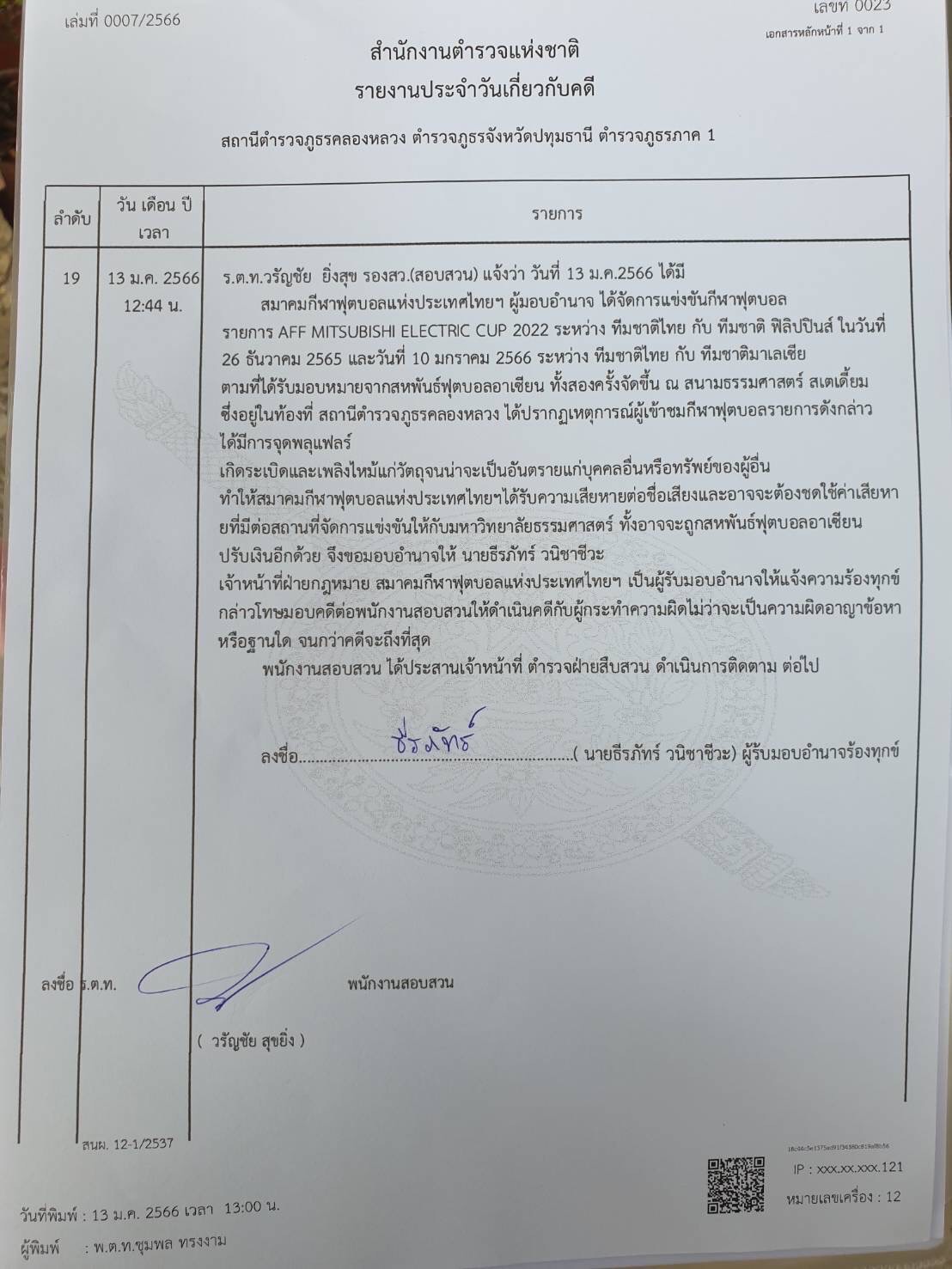 วันนี้ (13 ม.ค. 66) ที่ สภ.คลองหลวง จังหวัดปทุมธานี นายธีรภัทร์ วนิซาชีวะ ผู้รับมอบอำนาจ จากสมาคมกีฬาฟุตบอลแห่งประเทศไทย ได้เข้าแจ้งความร้องทุกข์ กับ ร.ต.ท.วรัญชัย ยิ่งสุข รองสว.(สอบสวน) กรณีที่สมามาคมฯ ได้จัดการแข่งขันกีฬาฟุตบอล รายการ AFF MITSUBISHI ELECTRIC CUP 2022 ระหว่าง ทีมชาติไทย กับ ทีมชาติ ฟิลิปปินส์ ในวันที่26 ธันวาคม 2565 และวันที่ 10 มกราคม 2566 ระหว่าง ทีมชาติไทย กับ ทีมชาติมาเลเชีย ตามที่ได้รับมอบหมายจากสหพันธ์ฟุตบอลอาเซียน