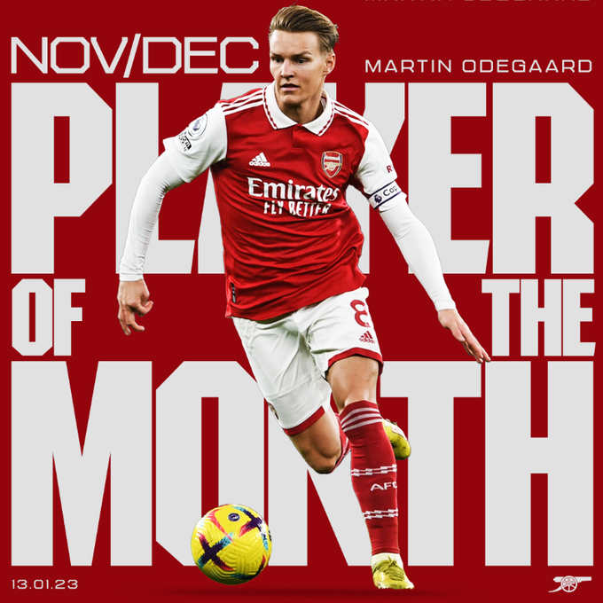 มาร์ติน โอเดอการ์ด กองกลางกัปตันทีม อาร์เซน่อล ผงาดคว้ารางวัลนักเตะยอดเยี่ยมของศึก พรีเมียร์ลีก ประจำเดือนพฤศจิกายน และธันวาคม ที่ผ่านมา จากการประกาศผลโหวตอย่างเป็นทางการเมื่อวันศุกร์ที่ 13 มกราคม
