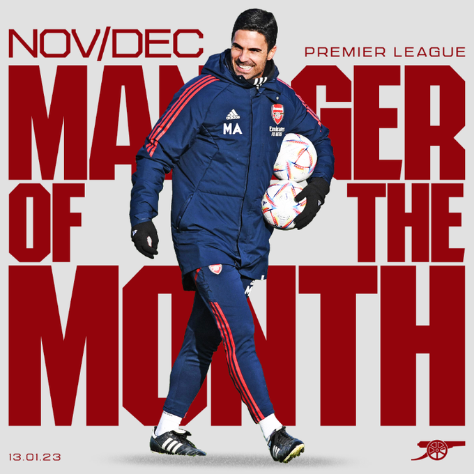 ส่วน มิเกล อาร์เตต้า กุนซือ อาร์เซน่อล ที่คว้ารางวัลผู้จัดการทีมยอดเยี่ยมของเดือนพฤศจิกายนและธันวาคม หลังพาทีมกวาดชัยชนะรวด 4 นัดตลอดช่วงเวลาดังกล่าว