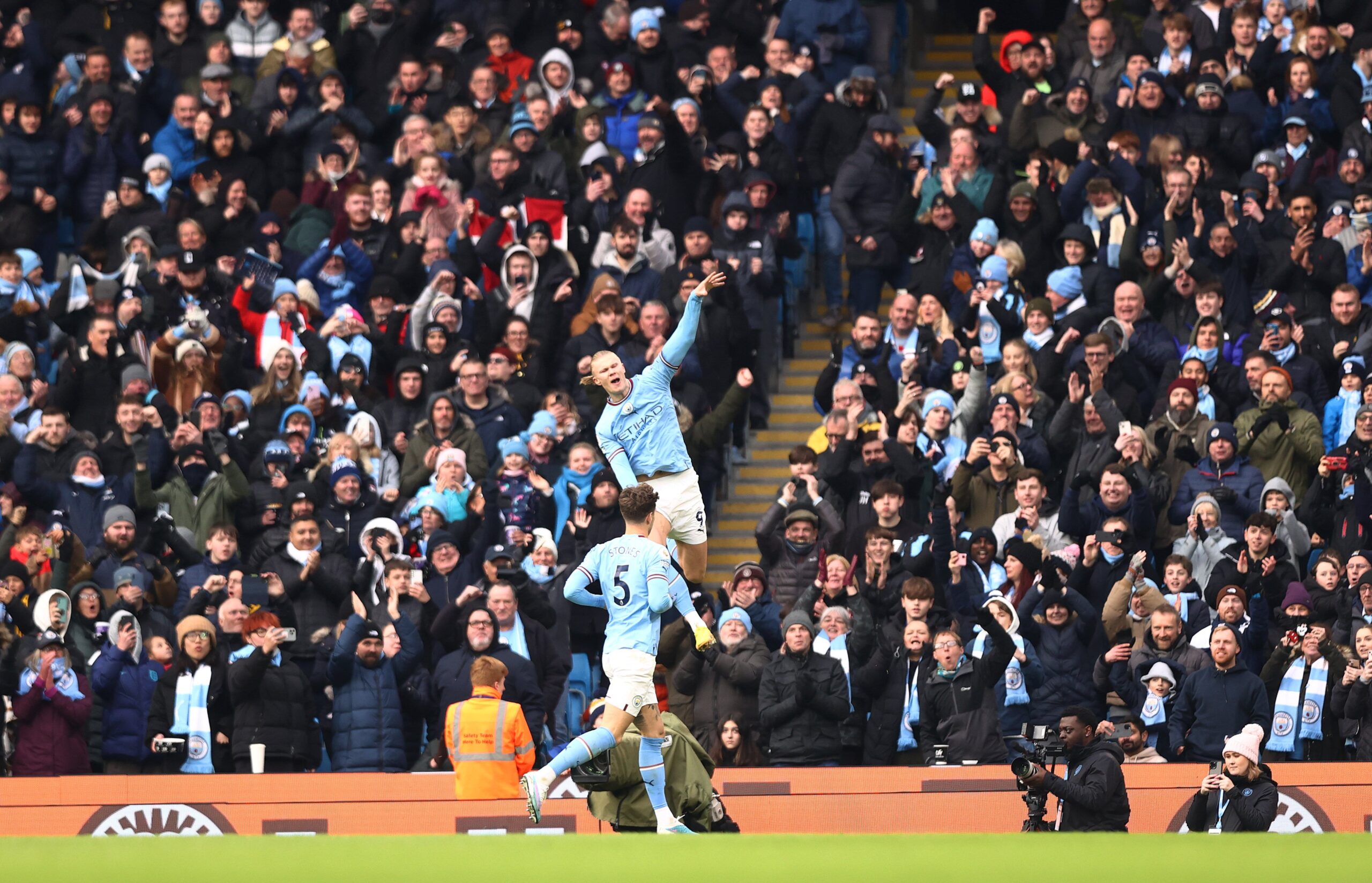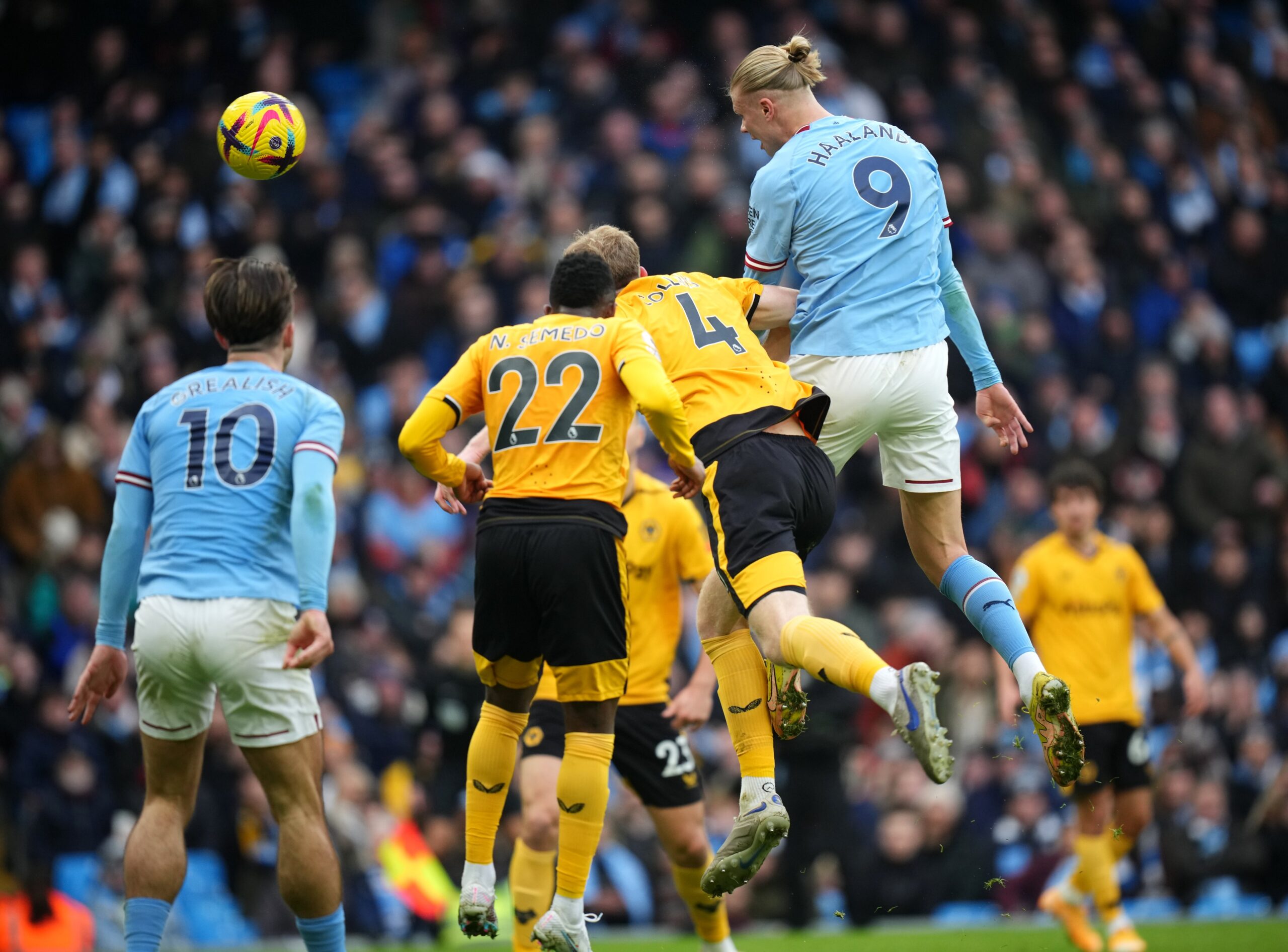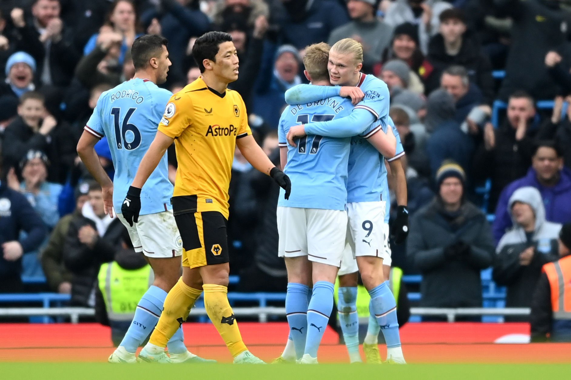 จากนั้นนาทีที่ 54 แมนฯ ซิตี้ นำห่าง 3-0 เมื่อ โชเซ ซา โกลของวูล์ฟส์ จ่ายบอลพลาดมาเข้าทาง ริยาด มาห์เรซ เลี้ยงเข้าเขตโทษก่อนจ่ายให้ เออร์ลิ่ง ฮาลันด์ ยิงเข้าไปง่ายๆ และเป็นแฮตทริกของ ฮาลันด์ ในเกมนี้อีกด้วย