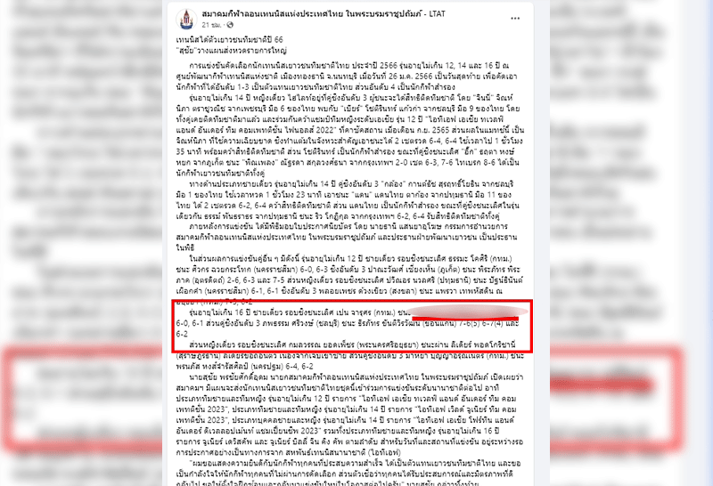 ล่าสุดกลายเป็นประเด็นร้อนในโลกออนไลน์อีกครั้ง เมื่อเพจเฟสบุ๊คสมาคมกีฬาลอนเทนนิสแห่งประเทศไทย ในพระบรมราชูปถัมภ์ โพสต์ประกาศผลการแข่งขันรายการ การแข่งขันคัดเลือกนักเทนนิสเยาวชนทีมชาติไทย ประจำปี 2566 ซึ่งปรากฎว่า มีเยาวชนคนดังกล่าว เข้าร่วมการแข่งขันด้วย ทำให้ชาวเน็ตถึงกับตาลุกเป็นไฟ รวมไปถึงติดเทรนทวิตเตอร์ ทั้งนี้ ในเพจเฟสบุ๊คสมาคมเองก็มีการแสดงความคิดเห็นไปในทางลบเช่นกัน อาทิ