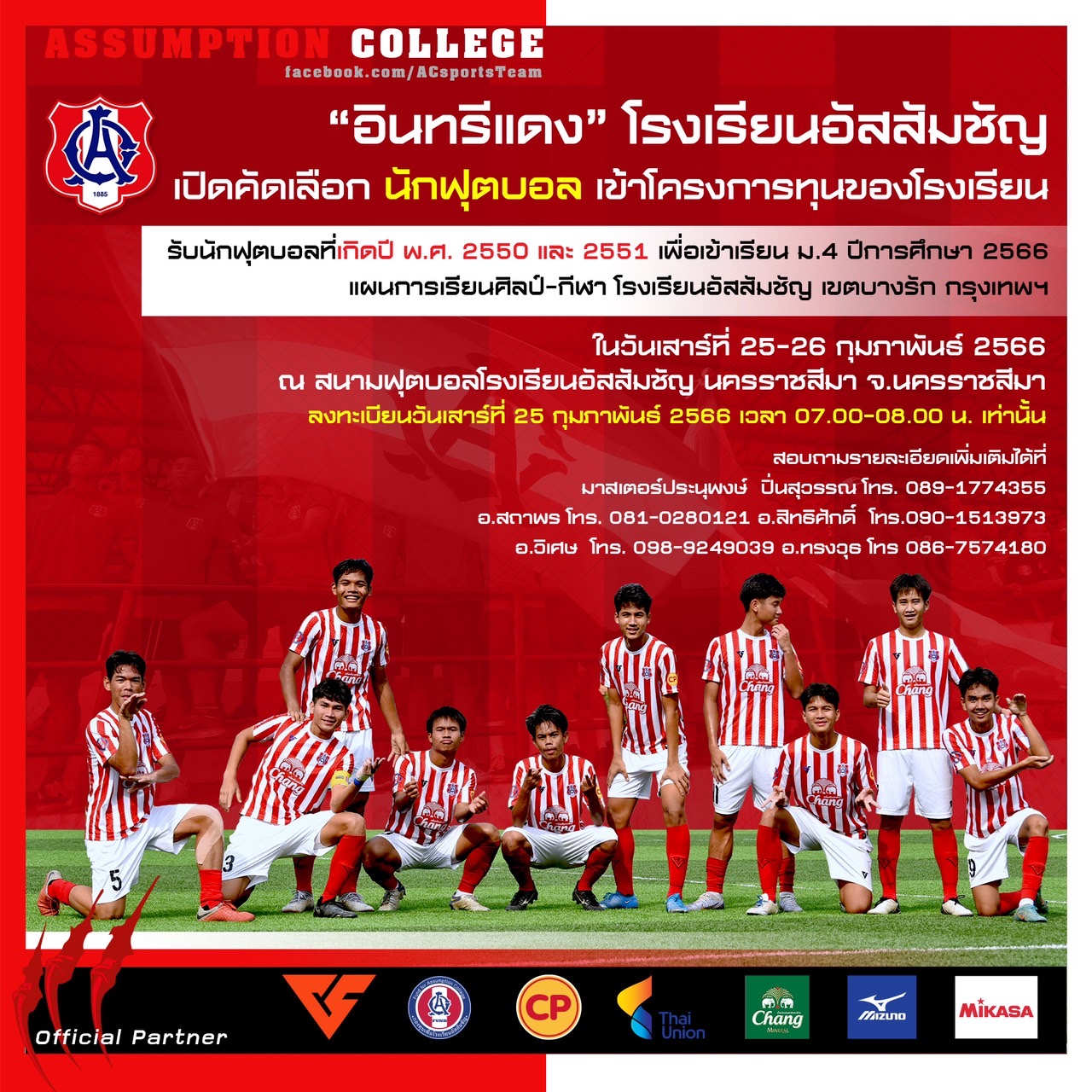 “อินทรีแดง” โรงเรียนอัสสัมชัญ กรุงเทพฯ เปิดคัดเลือก นักฟุตบอล เข้าโครงการทุนของ โรงเรียนอัสสัมชัญ ปีการศึกษา 2566