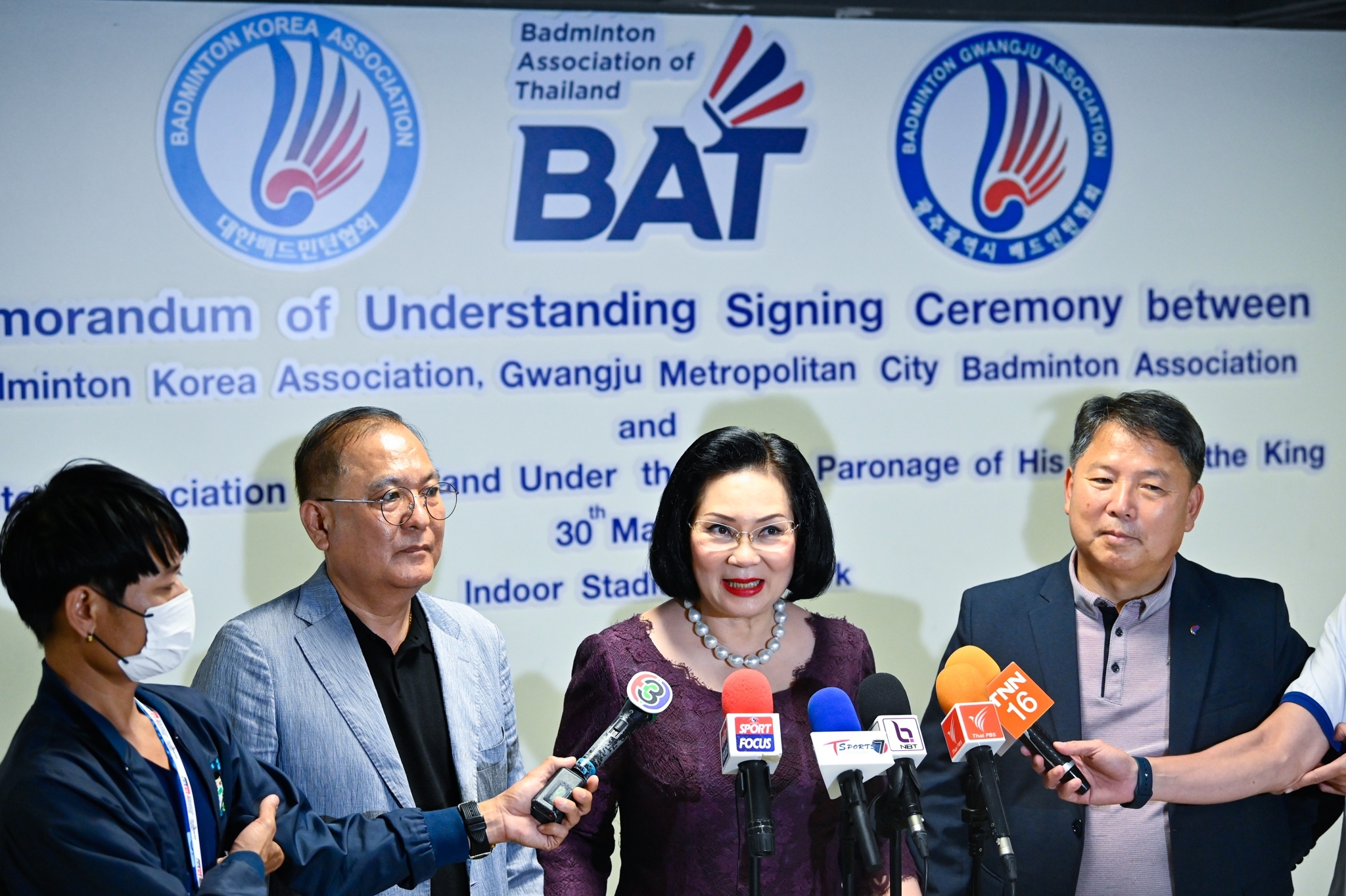 สมาคมกีฬาแบดมินตันแห่งประเทศไทย ในพระบรมราชูปถัมภ์ จัดพิธีลงนามความร่วมมือ MOU กับ สมาคมกีฬาแบดมินตันแห่งสาธารณรัฐเกาหลี และ สมาคมกีฬาแบดมินตันแห่งเมืองกวางจู เพื่อแลกเปลี่ยนผู้ฝึกสอน กรรมการผู้ตัดสิน ผู้เชี่ยวชาญ ศักยภาพของนักกีฬา และองค์ความรู้ด้านวิทยาศาสตร์การกีฬา ที่อินดอร์ สเตเดี้ยม การกีฬาแห่งประเทศไทย หัวหมาก เมื่อวันที่ 30 พฤษภาคม 2566 ในพิธีครั้งนี้ มี คุณหญิงปัทมา ลีสวัสดิ์ตระกูล กรรมการคณะกรรมการโอลิมปิกสากล (ไอโอซีเมมเบอร์) รองประธานสหพันธ์แบดมินตันโลก และนายกสมาคมกีฬาแบดมินตันแห่งประเทศไทยฯ พร้อมด้วย Mr. Kim Jong Soo มร.คิม จอง ซู ประธานสมาพันธ์ แบดมินตันเอเชีย และรองนายกสมาคมกีฬาแบดมินตันแห่งประเทศเกาหลีใต้ และ Mr. Hong Sung Gil มร. ฮอง ซุง กิล นายกสมาคมกีฬาแบดมินตันเมืองกวางจูว ประเทศเกาหลีใต้ ร่วมงาน