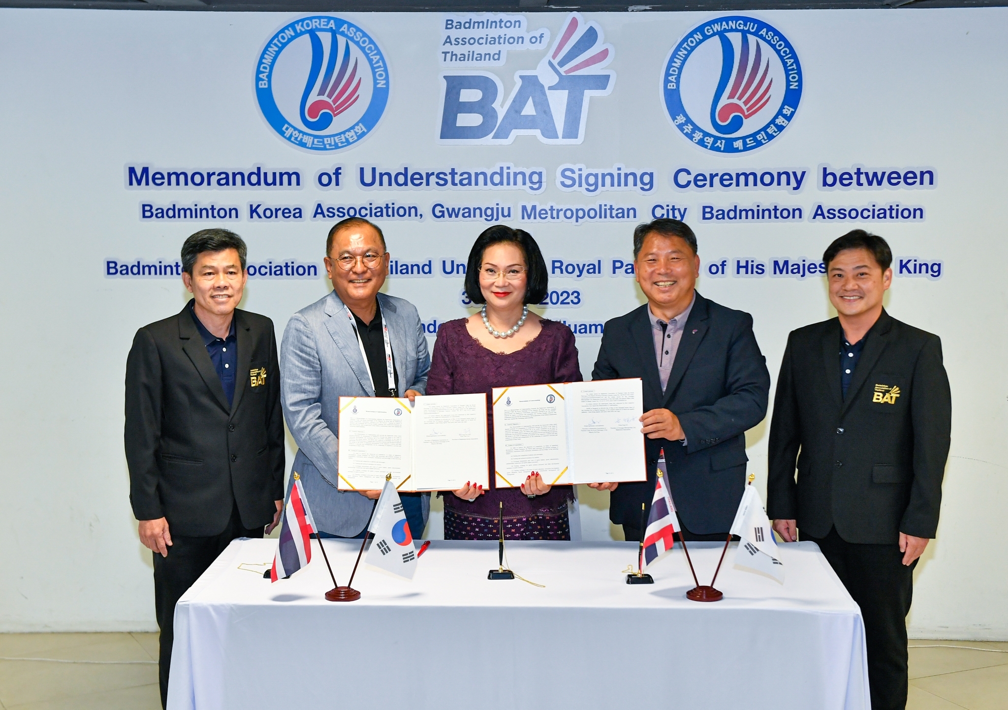 สมาคมกีฬาแบดมินตันแห่งประเทศไทย ในพระบรมราชูปถัมภ์ จัดพิธีลงนามความร่วมมือ MOU กับ สมาคมกีฬาแบดมินตันแห่งสาธารณรัฐเกาหลี และ สมาคมกีฬาแบดมินตันแห่งเมืองกวางจู เพื่อแลกเปลี่ยนผู้ฝึกสอน กรรมการผู้ตัดสิน ผู้เชี่ยวชาญ ศักยภาพของนักกีฬา และองค์ความรู้ด้านวิทยาศาสตร์การกีฬา ที่อินดอร์ สเตเดี้ยม การกีฬาแห่งประเทศไทย หัวหมาก เมื่อวันที่ 30 พฤษภาคม 2566 ในพิธีครั้งนี้ มี คุณหญิงปัทมา ลีสวัสดิ์ตระกูล กรรมการคณะกรรมการโอลิมปิกสากล (ไอโอซีเมมเบอร์) รองประธานสหพันธ์แบดมินตันโลก และนายกสมาคมกีฬาแบดมินตันแห่งประเทศไทยฯ พร้อมด้วย Mr. Kim Jong Soo มร.คิม จอง ซู ประธานสมาพันธ์ แบดมินตันเอเชีย และรองนายกสมาคมกีฬาแบดมินตันแห่งประเทศเกาหลีใต้ และ Mr. Hong Sung Gil มร. ฮอง ซุง กิล นายกสมาคมกีฬาแบดมินตันเมืองกวางจูว ประเทศเกาหลีใต้ ร่วมงาน