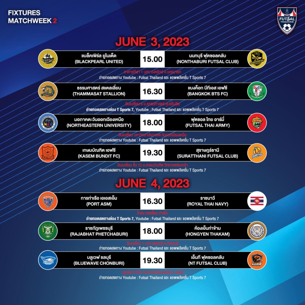 ฟุตซอลไทยลีก 2022 แมตซ์เดย์2 วันเสาร์ที่ 3 มิ.ย.66 เวลา 15.00 น. แบล็คเพิร์ล ยูไนเต็ด พบ นนทบุรี ฟุตซอลคลับ ที่อาคารกีฬา 1 มศว องครักษ์ จ.นครนายก ถ่ายทอดสด Youtube และ FB Futsalthailand และ แอพพลิเคชั่น T Sports 7 , เวลา 16.30 น. ธรรมศาสตร์ สแตลเลี่ยน พบ แบงค็อก บีทีเอส ที่ยิมเนเซี่ยม 6 ม.ธรรมศาสตร์ ศูนย์รังสิต ถ่ายทอดสด Youtube และ FB Futsalthailand และ ช่องฟรีทีวี T Sports 7,