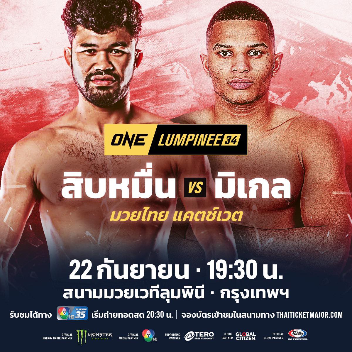 ติดตามชม “สิบหมื่น vs มิเกล” ศึก ONE ลุมพินี 34 ถ่ายทอดสดจากสนามมวยเวทีลุมพินี (รามอินทรา) วันศุกร์ที่ 22 ก.ย.นี้ คู่แรกเริ่มเวลา 19.30 น. และรับชมทางช่องทางต่าง ๆ ดังนี้