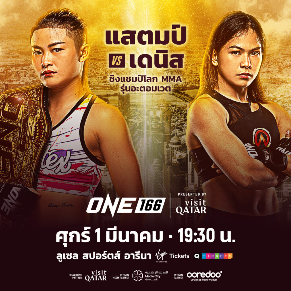 “แสตมป์ แฟร์เท็กซ์” แชมป์โลก ONE MMA รุ่นอะตอมเวต (105-115 ป.) ขวัญใจชาวไทย ได้ฤกษ์ป้องกันบัลลังก์ครั้งแรก ปะทะเพื่อนรัก “เดนิส แซมโบอันกา” นักสู้สาวชาวฟิลิปปินส์ ในศึก ONE 166 ที่ จะยกทัพไปจัดการแข่งขันที่ประเทศกาตาร์เป็นครั้งแรก