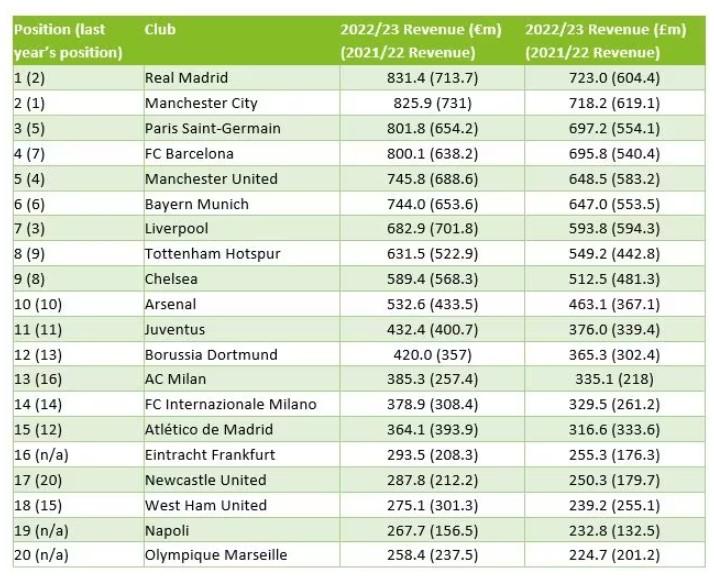 โดย “ราชันชุดขาว” มีรายได้ในซีซั่นที่แล้ว 831.4 ล้านยูโร(32,314.76 ล้านบาท) ส่วน “เรือใบสีฟ้า” หล่นจากอันดับ 1 มาอยู่ที่ 2 หลังมีรายได้ 825.9 ล้านยูโร(32,100.99 ล้านบาท) ซึ่งรายได้ดังกล่าวมาจากการที่ทีมคว้า 3 แชมป์ในฤดูกาลที่ผ่านมา (เอฟเอ คัพ, พรีเมียร์ลีก และ ยูฟ่า  แชมเปี้ยนส์ ลีก)