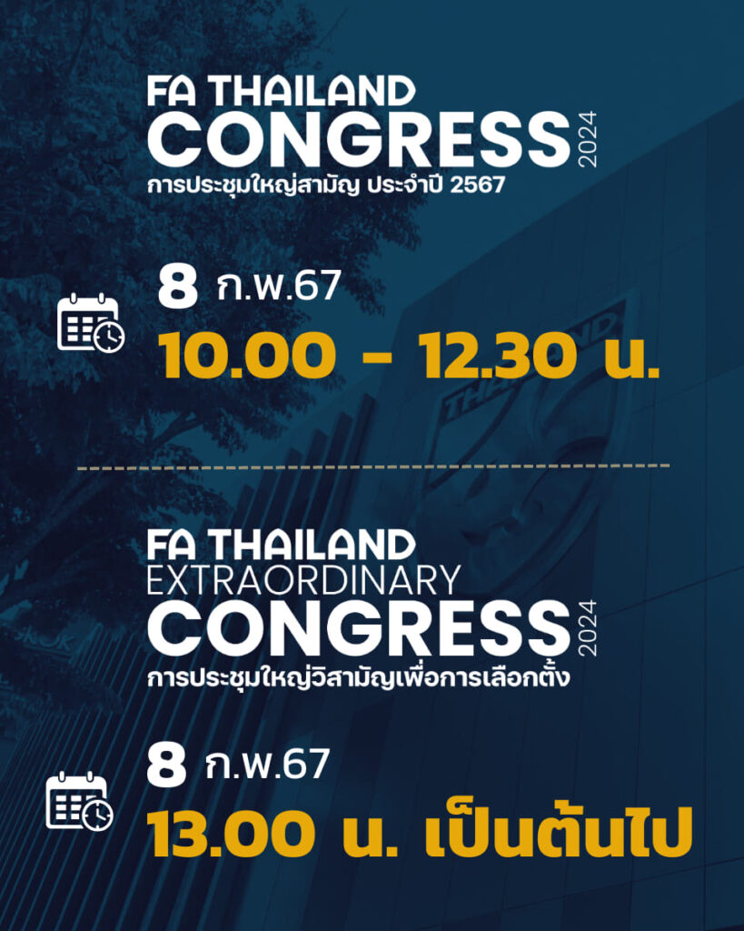 สมาคมกีฬาฟุตบอลแห่งประเทศไทยฯ แจ้งกำหนดการประชุมสำคัญ 2 งาน ในวันที่ 8 กุมภาพันธ์ 2567