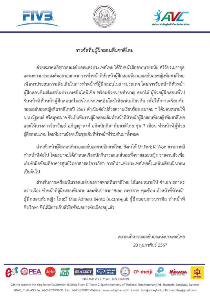 “ส่วนหัวหน้าผู้ฝึกสอนทีมวอลเลย์บอลชายทีมชาติไทย ยังคงให้ พัค กีวอน ชาวเกาหลีใต้ ทําหน้าที่ต่อไป โดยสมาคมได้กําหนดเรียกนักกีฬาวอลเลย์บอลทั้งชายและหญิง รายงานตัวเพื่อ เก็บตัวฝึกซ้อมที่อาคารศูนย์วิทยาศาสตร์การกีฬา การกีฬาแห่งประเทศไทยตั้งแต่ต้นเดือนมีนาคม เป็นต้นไป”