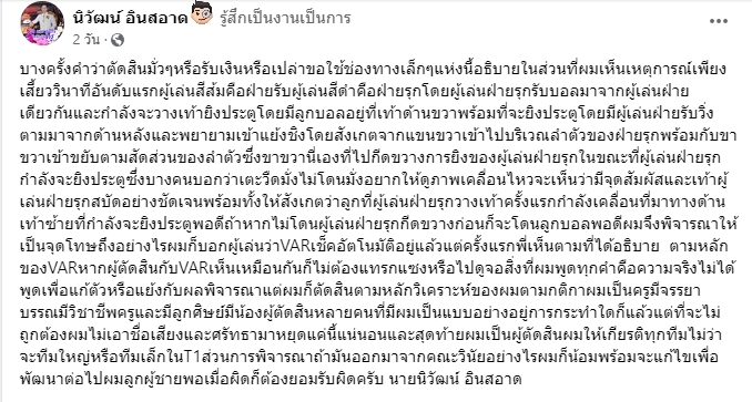 ต่อมา ไทยลีก ได้ตัดสินลงโทษ เปานิวัฒน์ อินสะอาด ไม่ให้ลงทำหน้าที่เป็นเวลา 2 เดือน ล่าสุดเจ้าตัว ได้ออกมาโพสต์ชี้แจงผ่านเฟซบุ๊ค ถึงจังหวะปัญหาดังกล่าวว่า