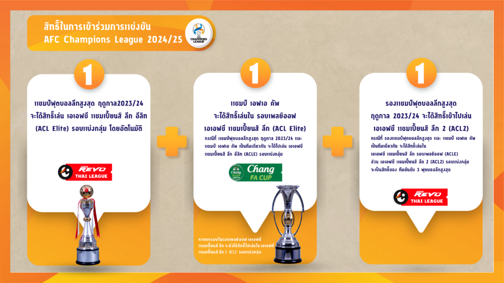 สมาคมกีฬาฟุตบอลแห่งประเทศไทยฯ และ บริษัท ไทยลีก จำกัด แจ้งขอสรุปสิทธิ์ในการเข้าร่วมการแข่งขัน AFC Champions League 2024/25 ตามที่ สมาพันธ์ฟุตบอลแห่งเอเชีย (เอเอฟซี) ได้มีการปรับเปลี่ยนรูปแบบการแข่งขันฟุตบอลสโมสรเอเชียเป็นรูปแบบใหม่ในฤดูกาล 2024/25 โดยจะมีทั้งหมด 3 รายการ คือ ACGL The AFC Challenge League (Tier 3), ACL2 The AFC Champions League 2 (Tier 2) และ ACL Elite The AFC Champions League Elite (Tier 1)