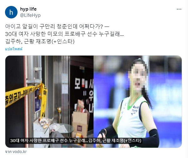 วงการวอลเลย์บอลเกาหลีใต้ เกิดเรื่องเศร้า เมื่อมีรายงานข่าวว่า คิม จู-ฮา อดีตลิเบอโร่ของ ฮุนได ฮิลล์สเตรท ถูกพบว่า เสียชีวิต ในโรงแรมแห่งหนึ่ง