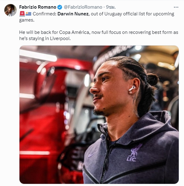 “ดาร์วิน นูนเญซ” ขอถอนตัวจากทีมชาติอุรุกวัย ในเกมอุ่นเครื่องช่วงฟีฟ่า เดย์ หลังมีอาการบาดเจ็บแฮมสตริง จากเกมพ่าย แมนเชสเตอร์ ยูไนเต็ด ในศึกเอฟเอ คัพ เมื่อวันอาทิตย์ที่ผ่านมา