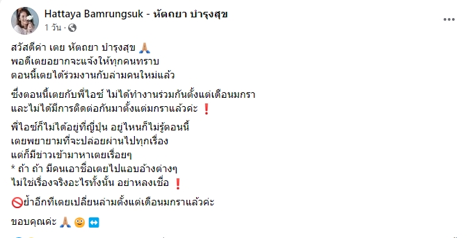 “สวัสดีค่า เตย หัตถยา บำรุงสุข อดีเตยอยากจะแจ้งให้ทุกคนทราบ ตอนนี้เตยได้ร่วมงานกับล่ามคนใหม่แล้ว ซึ่งตอนนี้เตยกับพี่ไอซ์ ไม่ได้ทำงานร่วมกันตั้งแต่เดือนมกรา และไม่ได้มีการติดต่อกันมาตั้งแต่มกราแล้วค่ะ พี่ไอซ์ก็ไม่ได้อยู่ที่ญี่ปุ่น อยู่ไหนก็ไม่รู้ตอนนี้ เตยพยายามที่จะปล่อยผ่านไปทุกเรื่องแต่ก็มีข่าวเข้ามาหาเตยเรื่อยๆ ถ้าพี่ไอซ์เอาชื่อเตยไปแอบอ้างต่างๆ ไม่ใช่เรื่องจริงอะไรทั้งนั้น อย่าหลงเชื่อ ย้ำอีกทีเตยเปลี่ยนล่ามตั้งแต่เดือนมกราแล้วค่ะ ขอบคุณค่ะ”