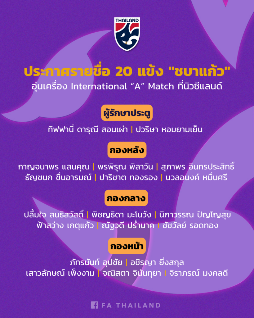สมาคมฯ ประกาศรายชื่อ 20 แข้ง “ชบาแก้ว” ลุยอุ่นเครื่อง International “A” Match ที่ นิวซีแลนด์