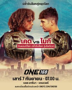“ไมกี มูซูเมกี” แชมป์โลก ONE ปล้ำจับล็อก รุ่นฟลายเวต (125 – 135 ป.) วัย 27 ปี จากสหรัฐอเมริกา ลุ้นสร้างประวัติศาสตร์ในฐานะแชมป์ปล้ำจับล็อก 2 รุ่นคนแรกของ ONE ด้วยการขยับน้ำหนักขึ้นไปท้าชิงบัลลังก์รุ่นไลต์เวต (155 – 170 ป.) จาก “เคด รูโทโล” นักรัดรุ่นน้องร่วมชาติ วัย 21 ปี ในศึก ONE 168 ที่จะจัดขึ้นเป็นครั้งที่ 2 ที่ประเทศสหรัฐอเมริกา ณ สังเวียน บอล อารีนา เมืองเดนเวอร์ รัฐโคโลราโด ในวันเสาร์ที่ 7 ก.ย.67