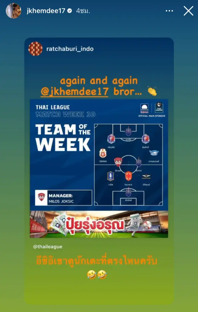 โดยข้อความ ระบุว่า “สวัสดีแฟนบอลไทยทุกคน ผมขอบคุณที่ทุกคนส่งข้อความมาแสดงความยินดีกับผมที่ติดทีมยอดเยี่ยมของไทยลีกในวีคนี้”