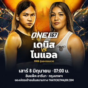 ติดตาม “โนแอล vs เดนิส” ศึก ONE 167: ตะวันฉาย vs โจ II ถ่ายทอดสดจากอิมแพ็ค อารีนา เมืองทองธานี วันเสาร์ที่ 8 มิ.ย.67 จองบัตรเข้าชมในสนามผ่านทาง THAI TICKET MAJOR คู่แรกเริ่มเวลา 07.00 น. และรับชมทางช่องทางต่าง ๆ ดังนี้