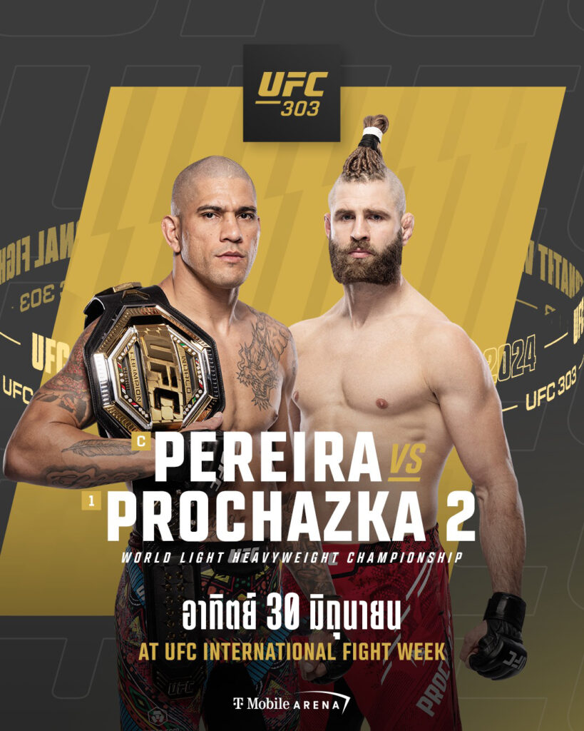 UFC องค์กรศิลปะป้องกันตัวและการต่อสู้แบบผสมสาน ที่ยิ่งใหญ่ที่สุดในโลก เตรียมระเบิดศึกการต่อสู้ส่งท้ายเดือนมิถุนายน ภายใต้ศึก UFC 303 : PEREIRA VS PROCHÁZKA 2 คู่เอกจะเป็นป้องกันแชมป์โลกรุ่นไลต์เฮฟวีเวต ระหว่าง อเล็กซ์ เปเรย์รา เจ้าของตำแหน่งชาวบราซิล ที่จะพบกับ ยิรี โปรชาซกา คู่ปรับจากสาธารณะเช็กเป็นหนที่ 2 โดยจะระเบิดศึกกัน ณ สังเวียน T-Mobile Arena ,ลาส เวกัส ,สหรัฐอเมริกา วันอาทิตย์ที่ 30 มิถุนายนนี้