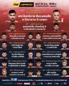 ศึก ONE ลุมพินี 68 ยกทัพจอมบู๊ระดับแถวหน้าของวงการลุยเต็มอัตราศึก สมศักดิ์ศรีนัดใหญ่ประจำไตรมาสสองของปี พร้อมถ่ายทอดสดจากสนามมวยเวทีลุมพินี (รามอินทรา) รับชมพร้อมกันใน 195 ประเทศทั่วโลก ในวันศุกร์ที่ 28 มิ.ย.นี้ เปิดฉากเดือดคู่แรกเวลา 19.30 น.