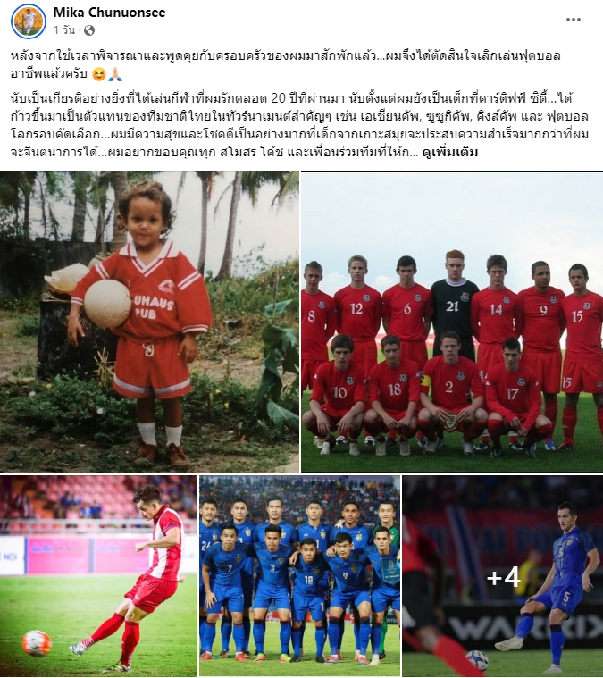 “มิก้า ชูนวลศรี” แนวรับของสโมสร ลำพูน วอร์ริเออร์ และ อดีตกองหลังทีมชาติไทย วัย 35 ปี ออกมาโพสต์เฟสบุ๊คส่วนตัว Mika Chunuonsee ประกาศแขวนสตั๊ดอย่างเป็นทางการแล้ว ปิดฉากค้าแข้งมากว่า 20 ปี โดยระบุข้อความว่า